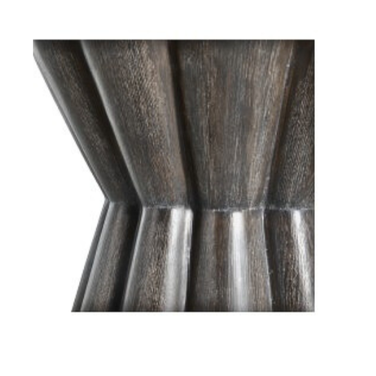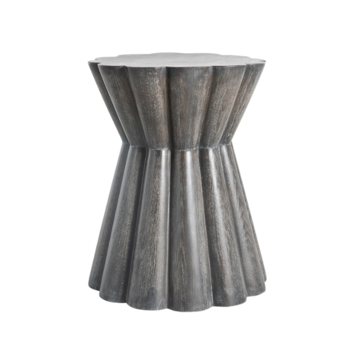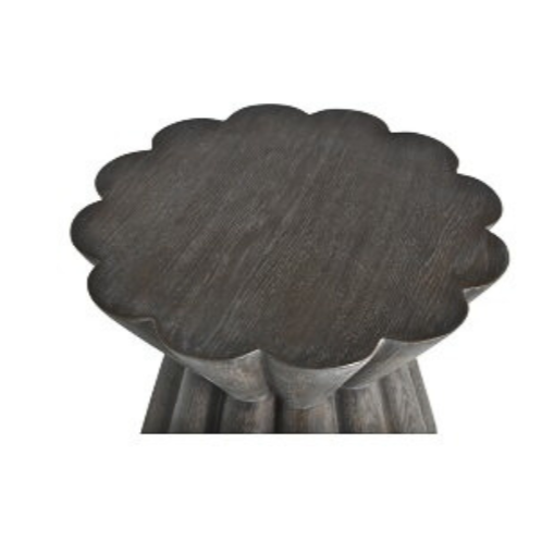 The Aria Side Table features a captivating design with moody hues and carefully scalloped edges. Its black finish accentuates the light woodgrain pattern, creating an interesting play of texture. This table's unique shape makes it a subtle yet standout piece in any room, perfect for adding a touch of elegance and character. Ideal for living rooms, bedrooms, or any space needing a sophisticated accent. Also comes in a light washed wood finish.