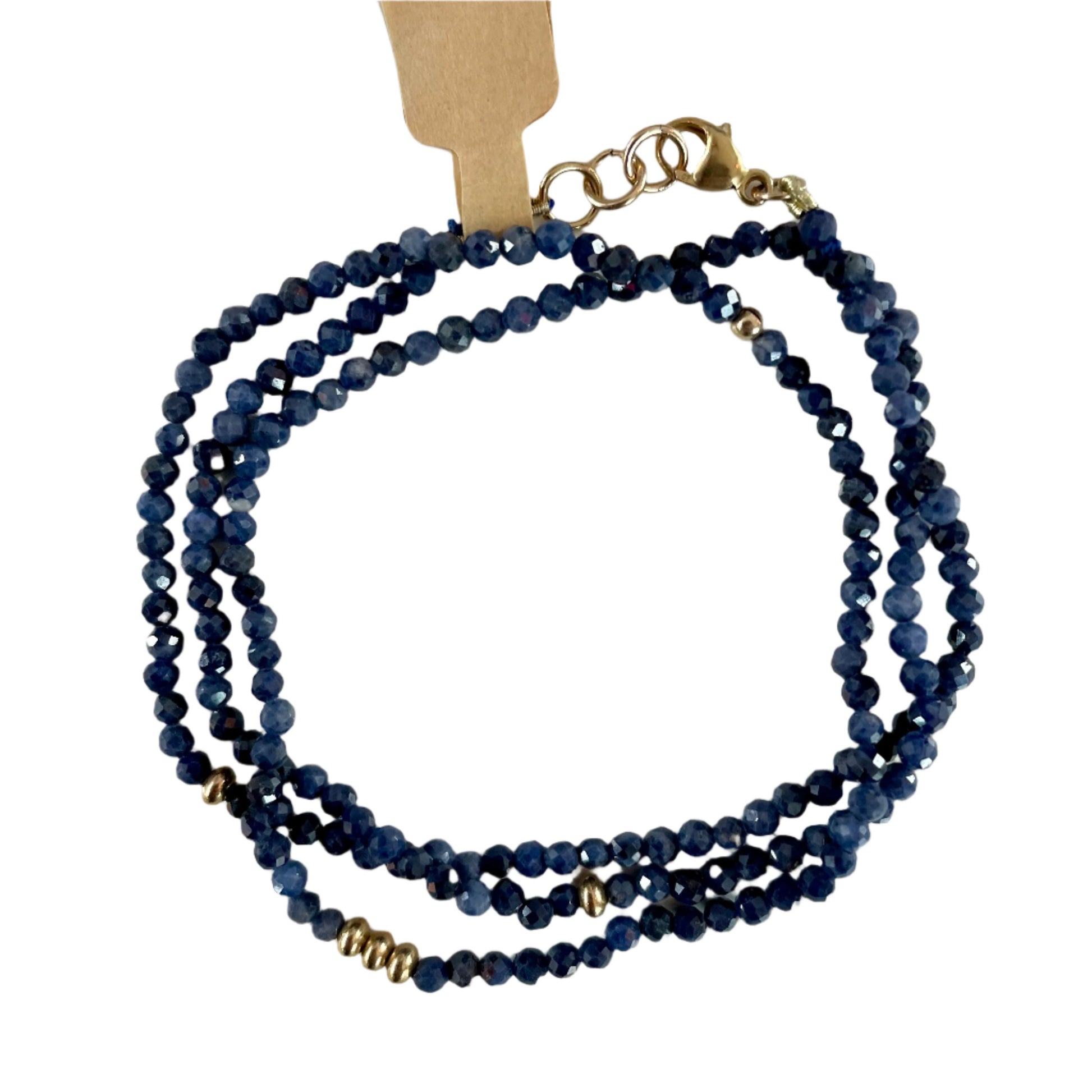 Locally handcrafted gemstone bracelet with hammered 14K gold fill beads. This piece wraps around your wrist several times, and looks beautiful solo or layered with other jewelry!