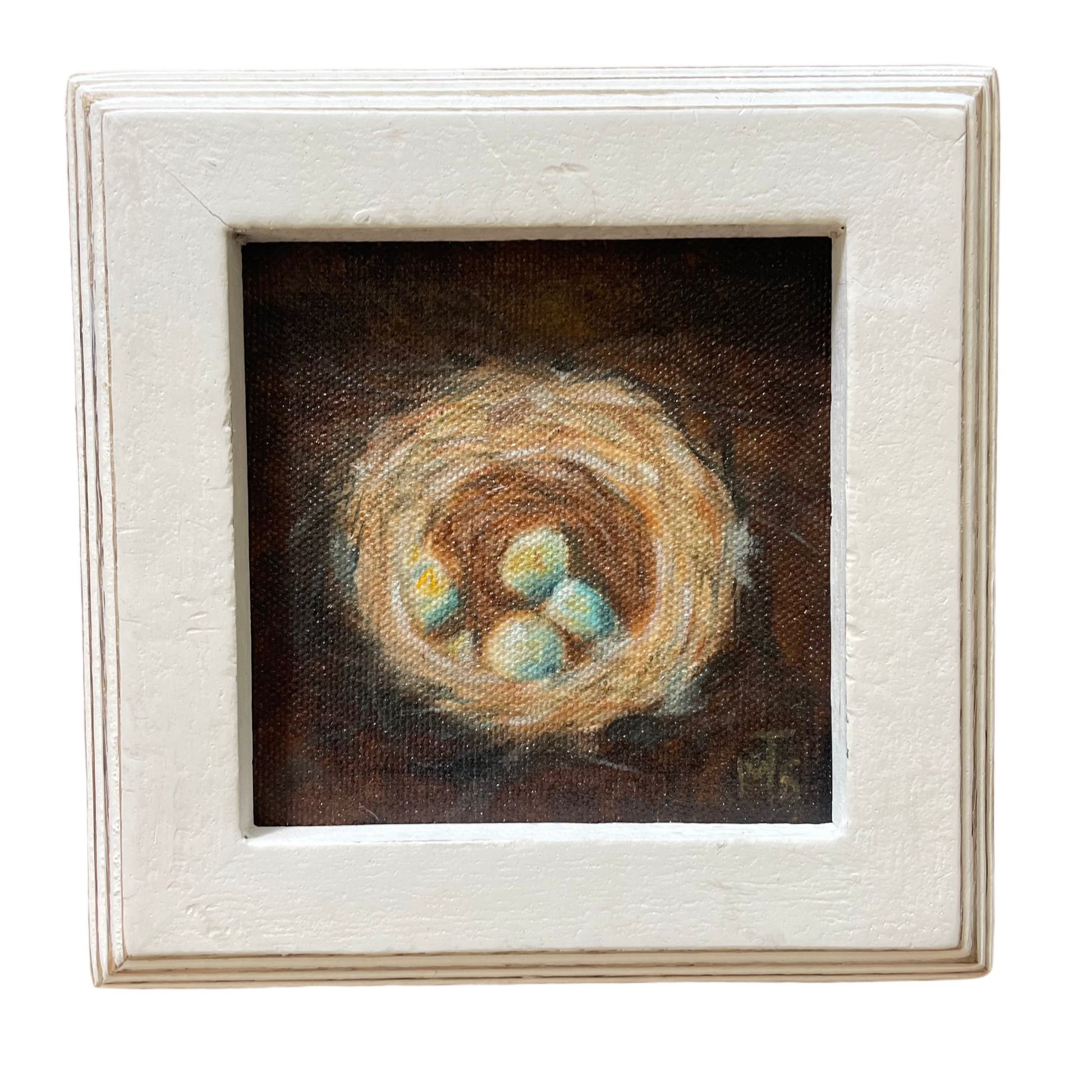 This charming Robin's Nest artwork is an original oil painting, perfectly showcased in a distressed white painted frame. Measuring 5.5" x 5.5", it adds a delightful touch of local artistry to any space.