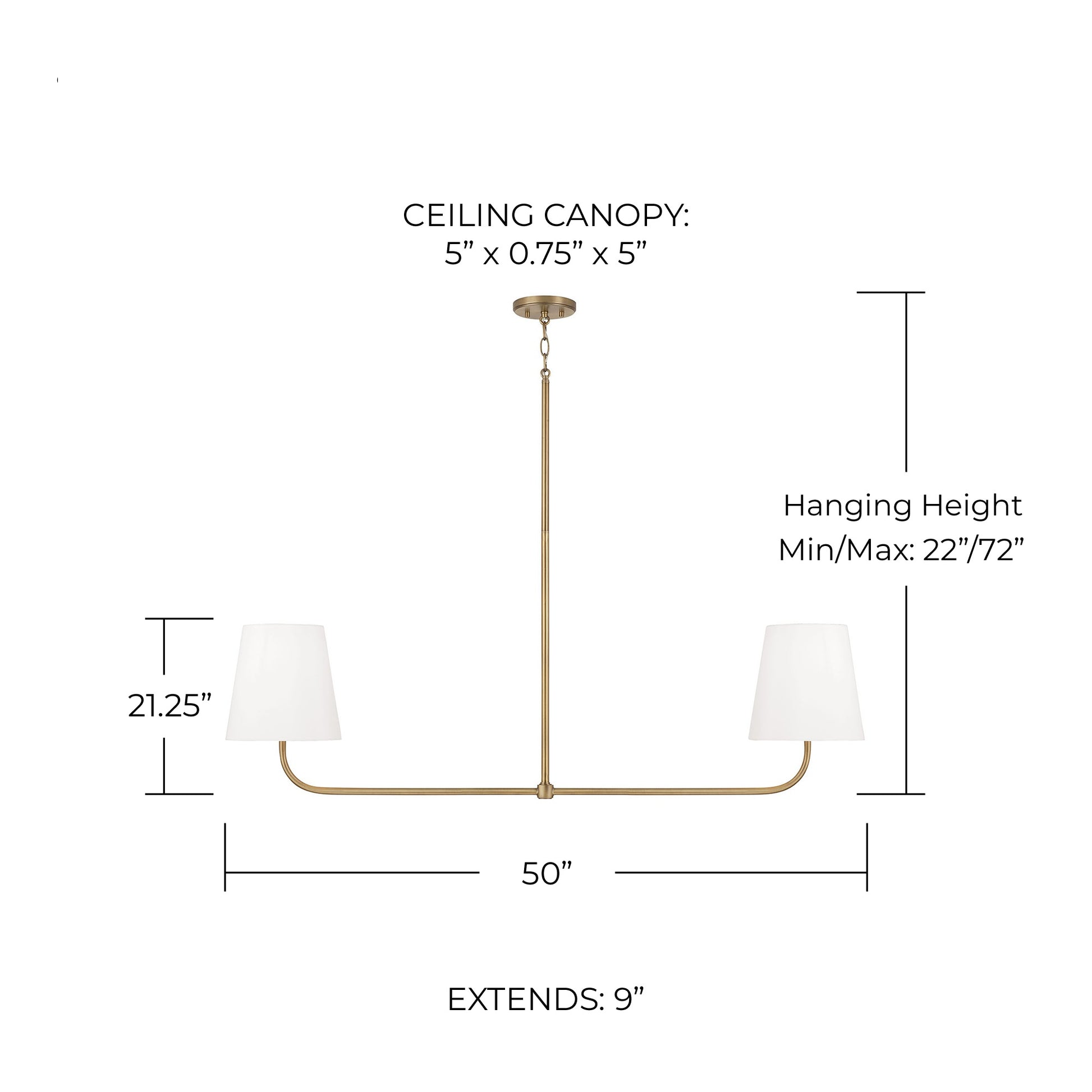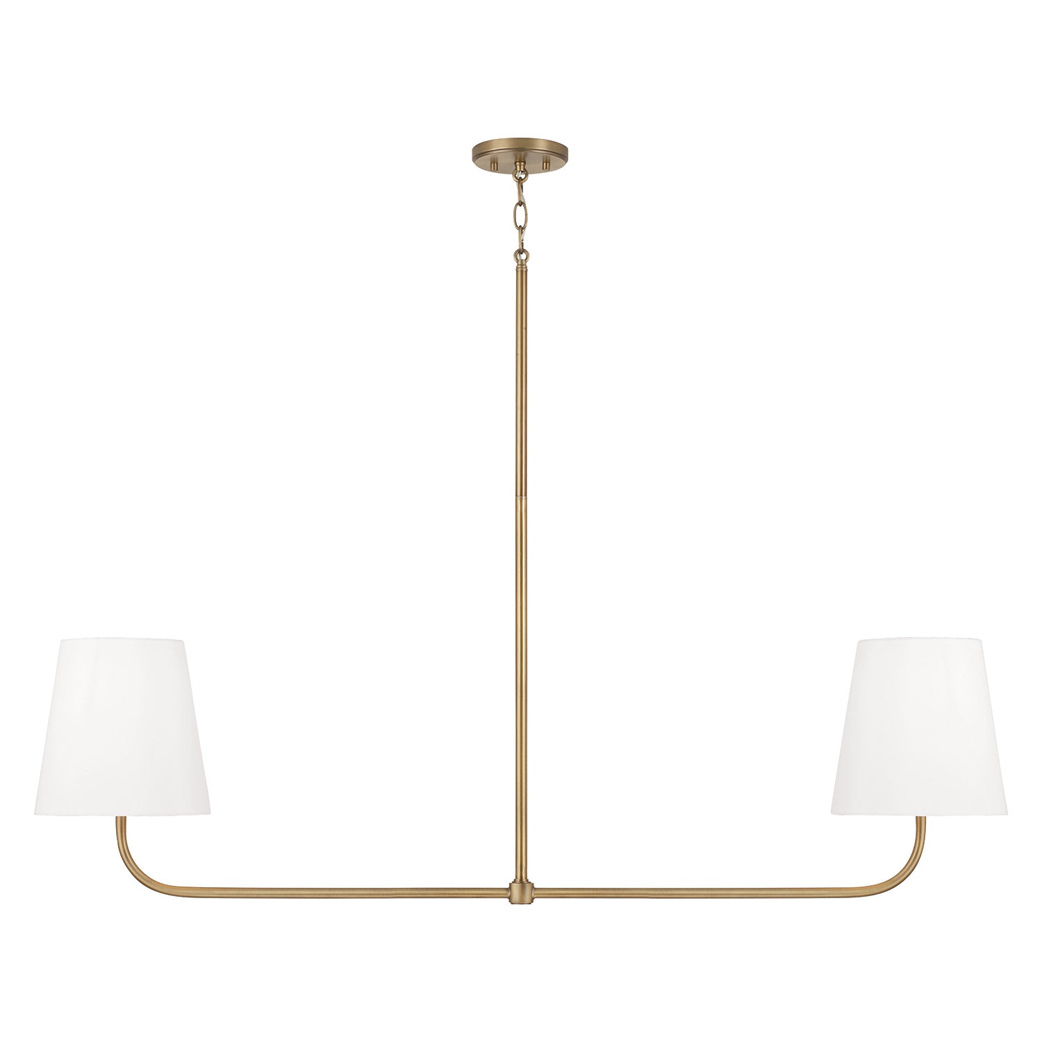 Embodying true minimalist form, the Brody Linear brings sleek, simplified style in a linear pendant chandelier. The Aged Brass finish enhances the classic look of the white fabric shades to deliver sophisticated, less-is-more design.