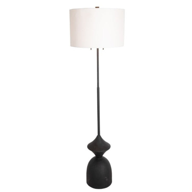 This sturdy, uniquely shaped black base floor lamp exudes sophistication and style. The slim metal rod extends upwards to support a large, white fabric drum shade, which diffuses light softly to create a warm, ambient glow in any room. Perfect for living rooms, bedrooms, or home offices. the Carson Floor Lamp adds a touch of contemporary flair while providing functional lighting.
