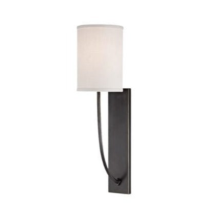 Liven up any living space with the fun and contemporary Colton Wall Sconce from Hudson Valley Lighting! This charming piece features a cylindrical linen shade that connects to a rectangular wall plate by way of a curved stem. Just one light source gives off a warm, cozy glow, and it comes in several chic non-solid finishes to fit your personal flair.
