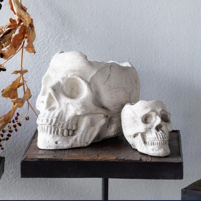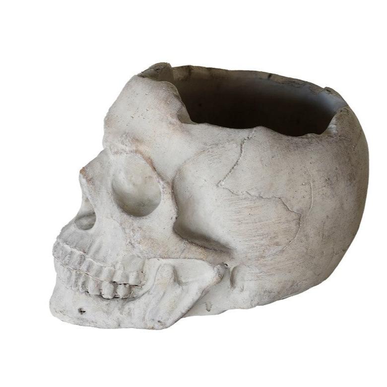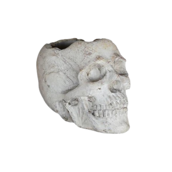 This skull head cement planter pot is perfect for small plants, flowers, herbs, air plants and succulents - artificial or real! Use it year round or makes for fun Halloween Decor! It's made of cement and can be used indoors or out.