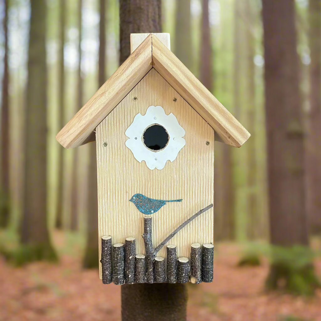 This locally made birdhouse is crafted using reclaimed wood from various sources such as construction sites, broken furniture, pallets and driftwood. All inside surfaces have been sanded and are free of varnishes, paints or other chemical in the nesting areas. The birdhouse has the following features: