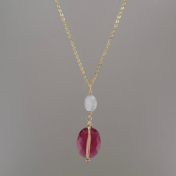 This locally handmade beauty is 14K Gold Fill, Ruby Quartz, and Moonstone. Inspired by the ancient world.