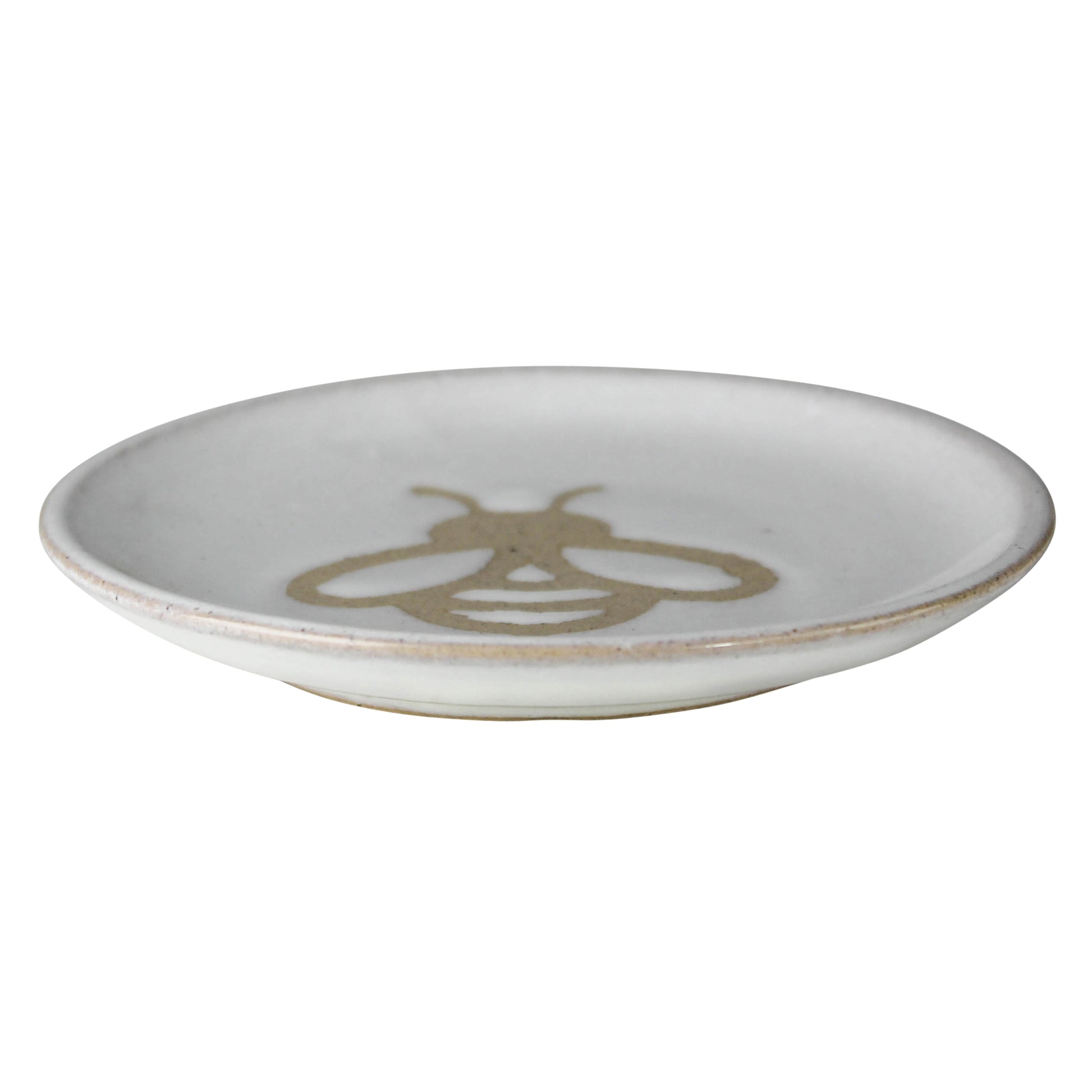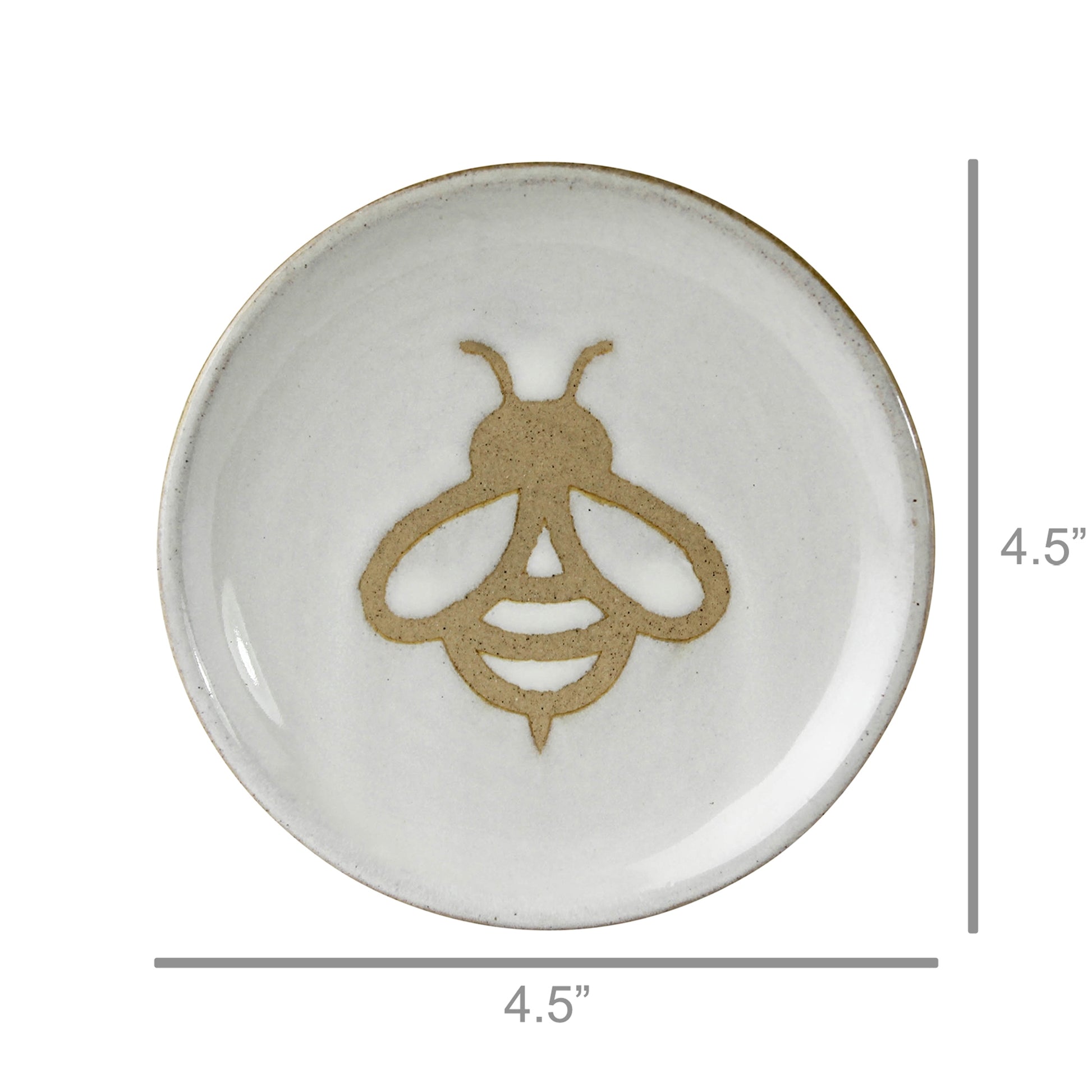 This round, glossy-white ceramic dish featuring a sweet honeybee icon shines as a coaster or catch-all for coins, trinkets, and baubles. Dimensions: 4.5″ x 4.5″ x 0.8″