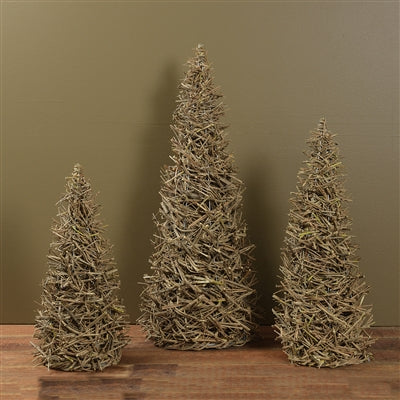 Fine cork branches cover a steel frame creating whimsical display trees with a woodland essence. Texture and inventive use of natural material offer a fresh take on the traditional pine tree formation.