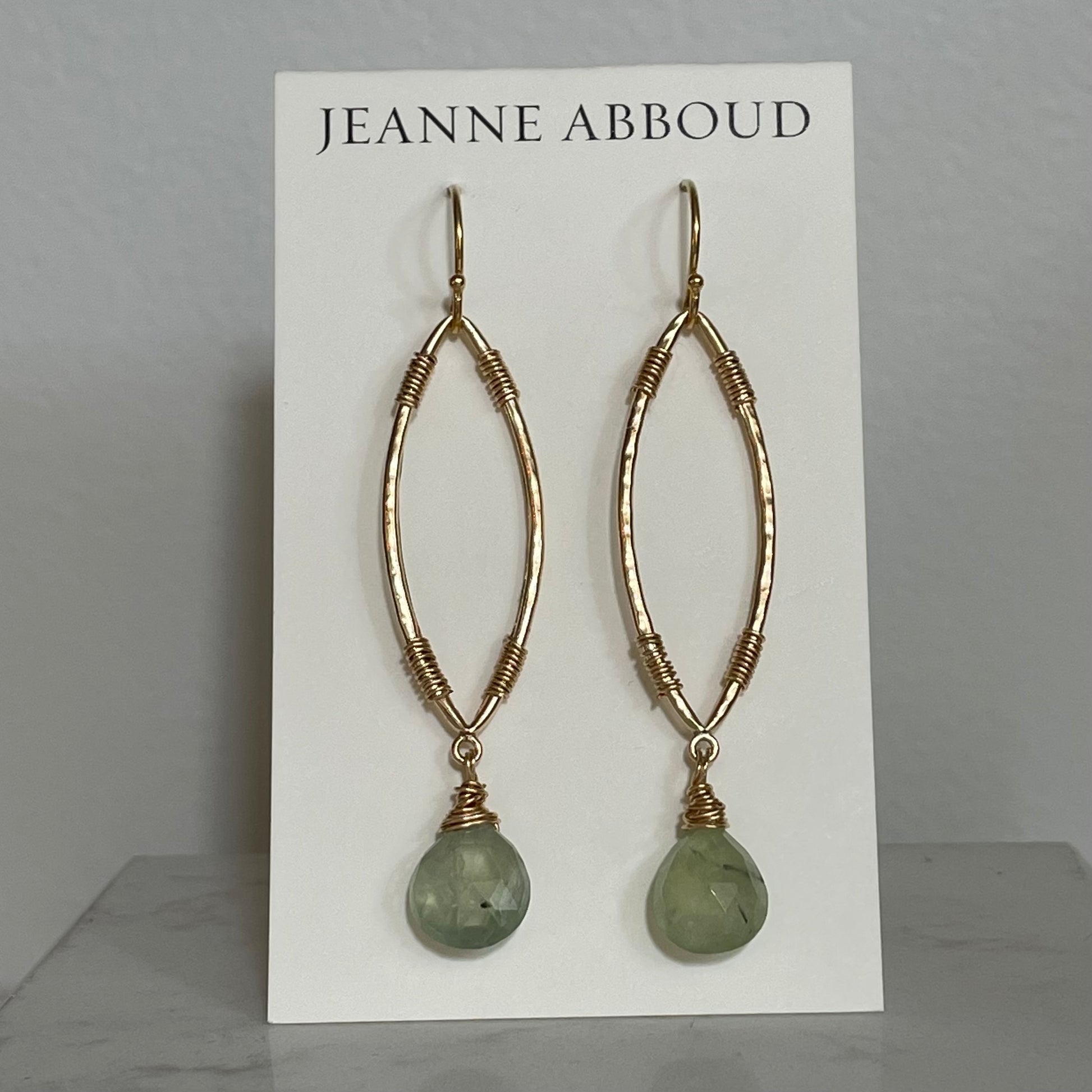 These locally handmade beauties are 14K Gold Fill and Prehnite and inspired by the ancient world.
