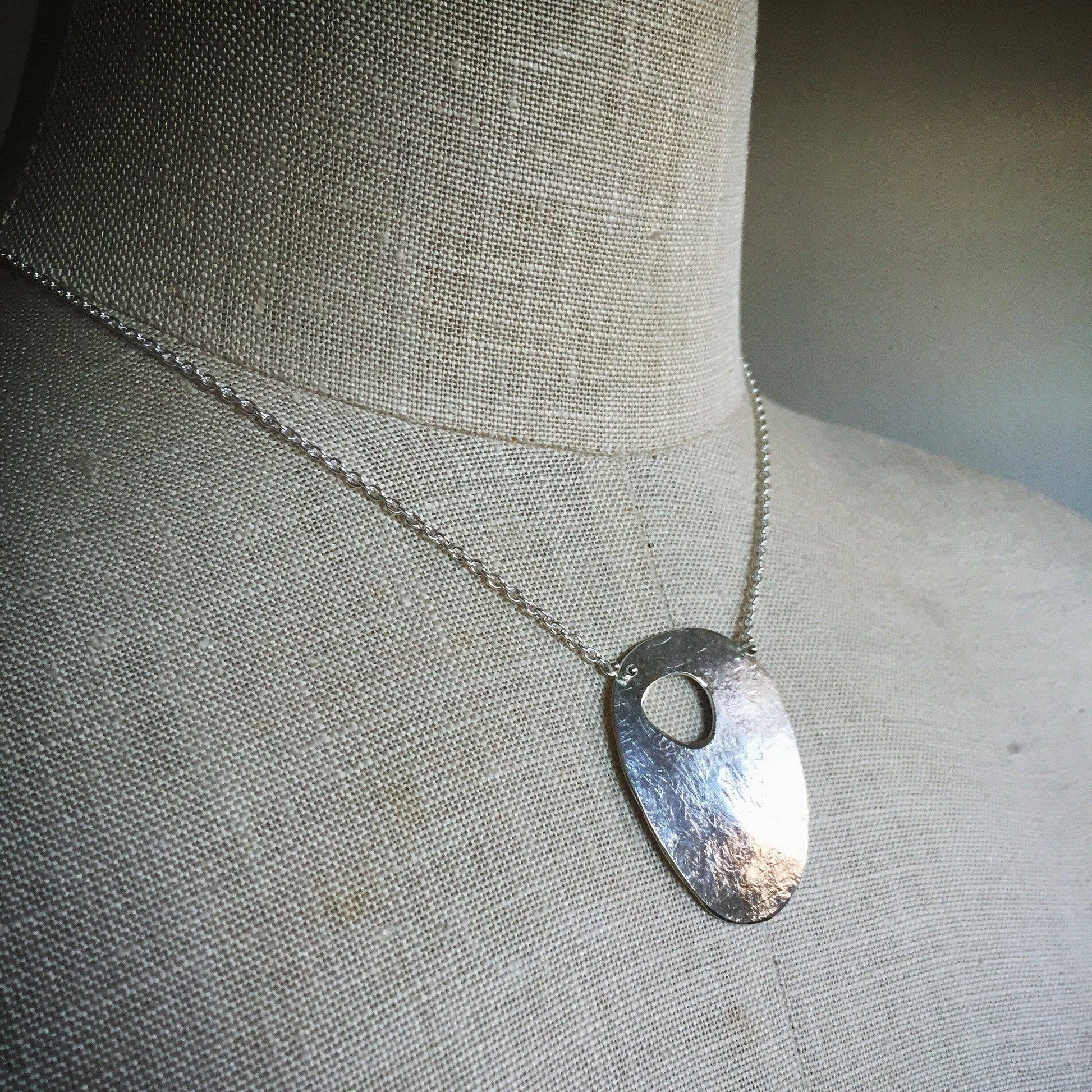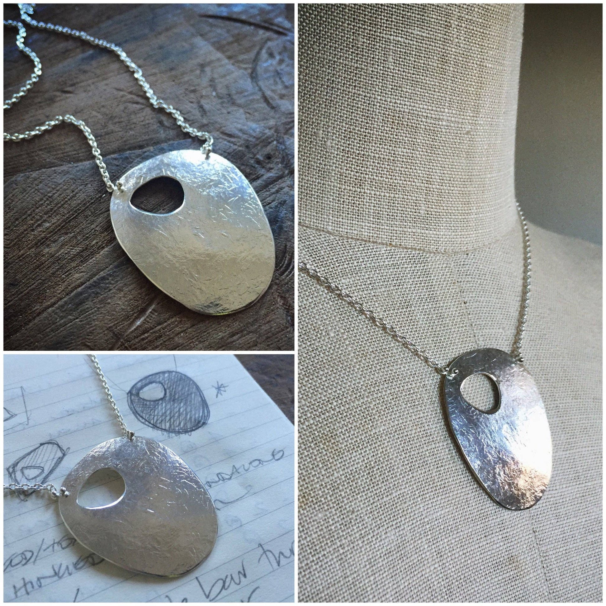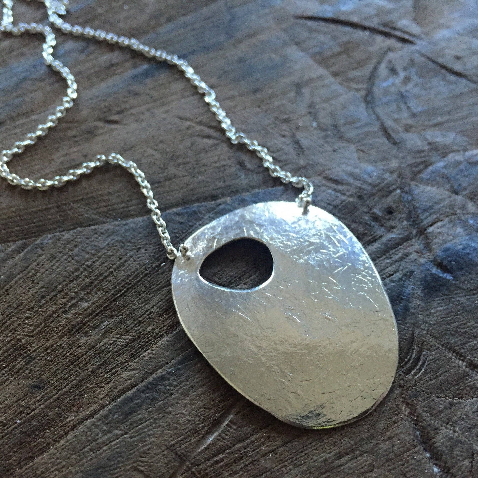 This hand textured and sculpted piece of silver has the feel of a weathered pebble found on your favorite beach. It's an elemental form that I keep returning to, over and over again- there's something about the simplicity of an oval and it's many iterations I want to work and rework. This piece is bold yet quiet- perfect for tee and jeans or a fancy dinner out with a chic sheath dress and heels. Your call. Want a moodier piece? Choose the oxidized version, shown in the second picture.