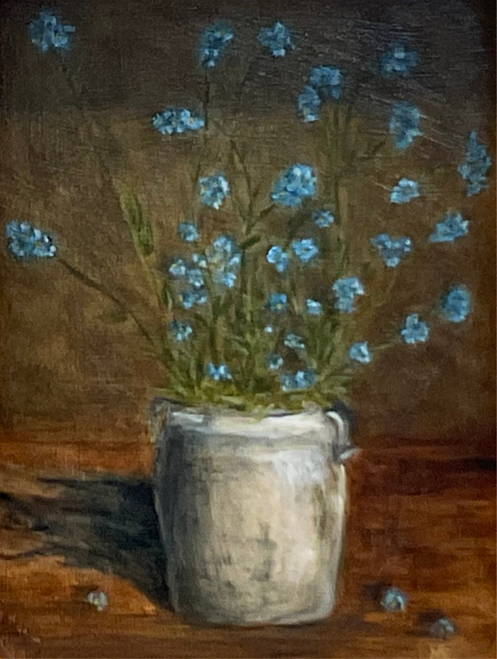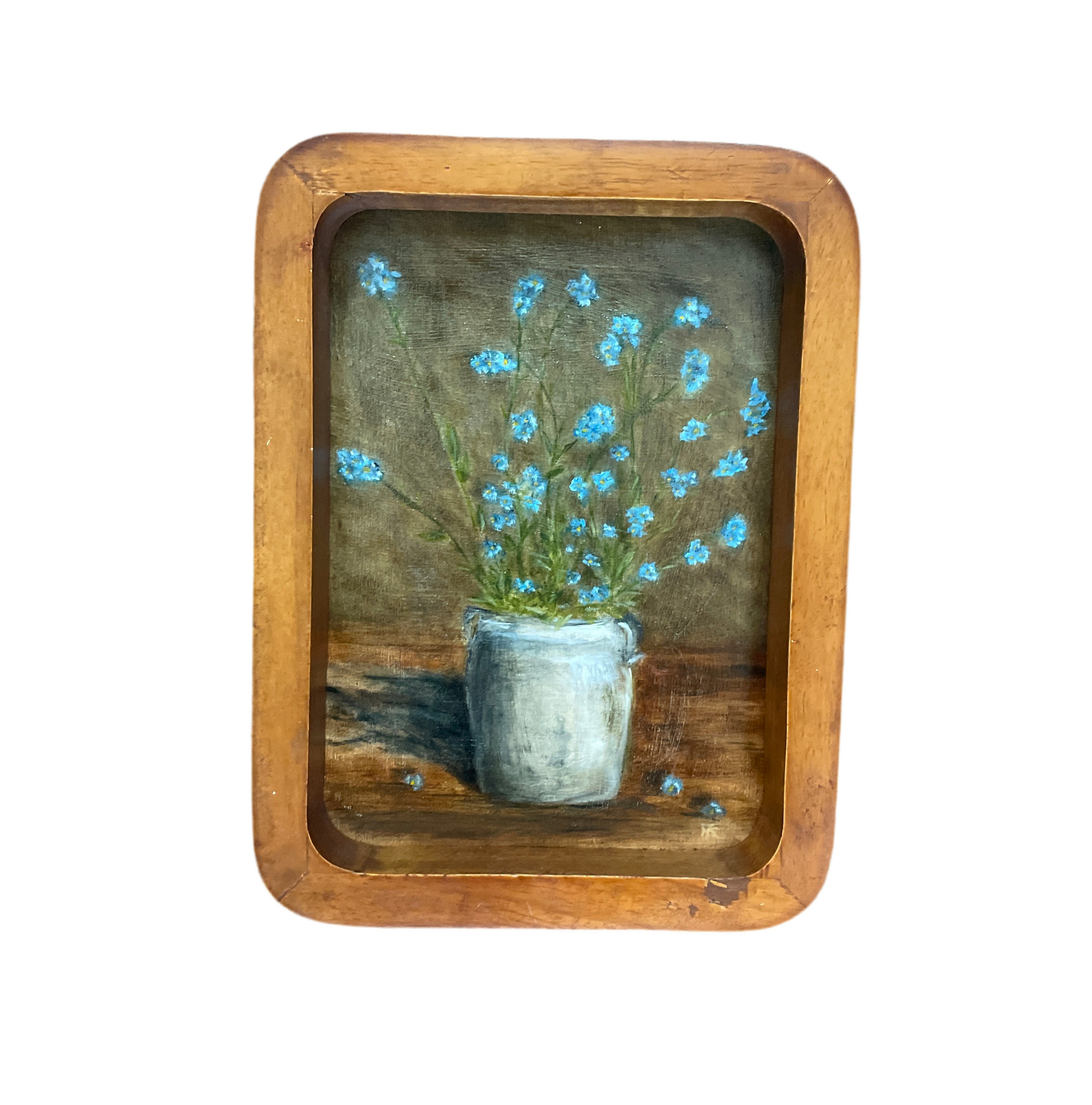 This charming "Forget Me Not" original oil painting, perfectly showcased in a wooden frame. Measuring 6" by 7.75", it adds a delightful touch of local artistry to any space.