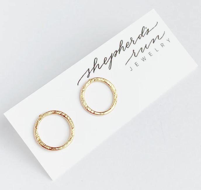 A Shepherd's Run best-seller, the small 14k yellow gold-fill halo stud is sure to please. A simple hammered circle big enough to be seen but not overwhelming for even the most demure of earring wearer.