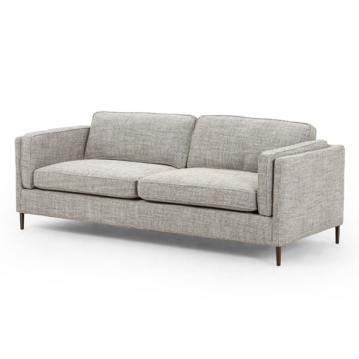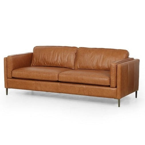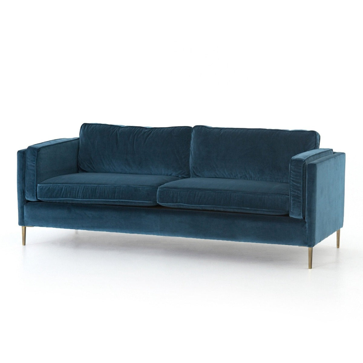 Clean, mid-century styling adopts regality via jewel tone upholstery. A velvety blend of polyester and cotton forms tailored lines while slim legs of antique brass add a sophisticated finishing touch.