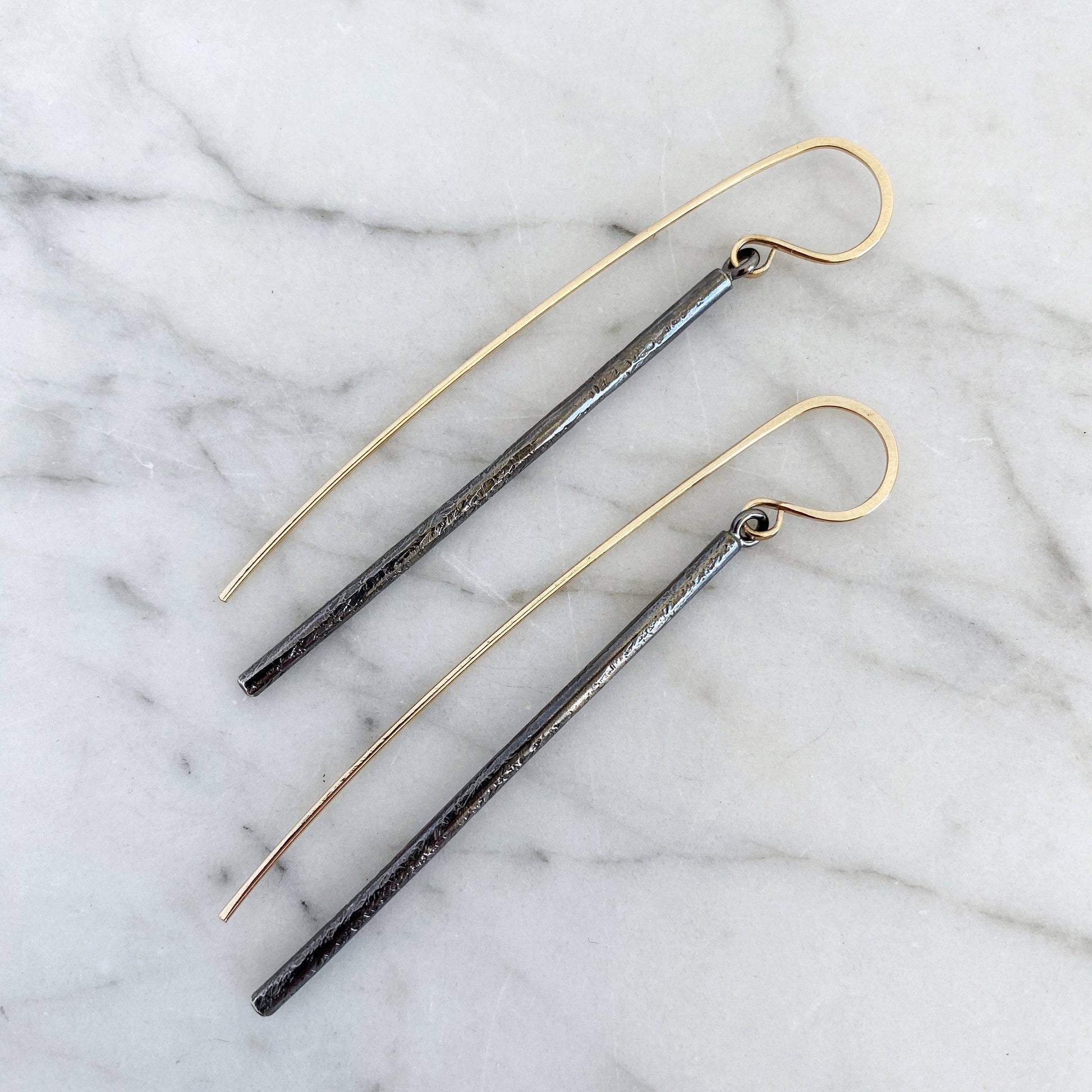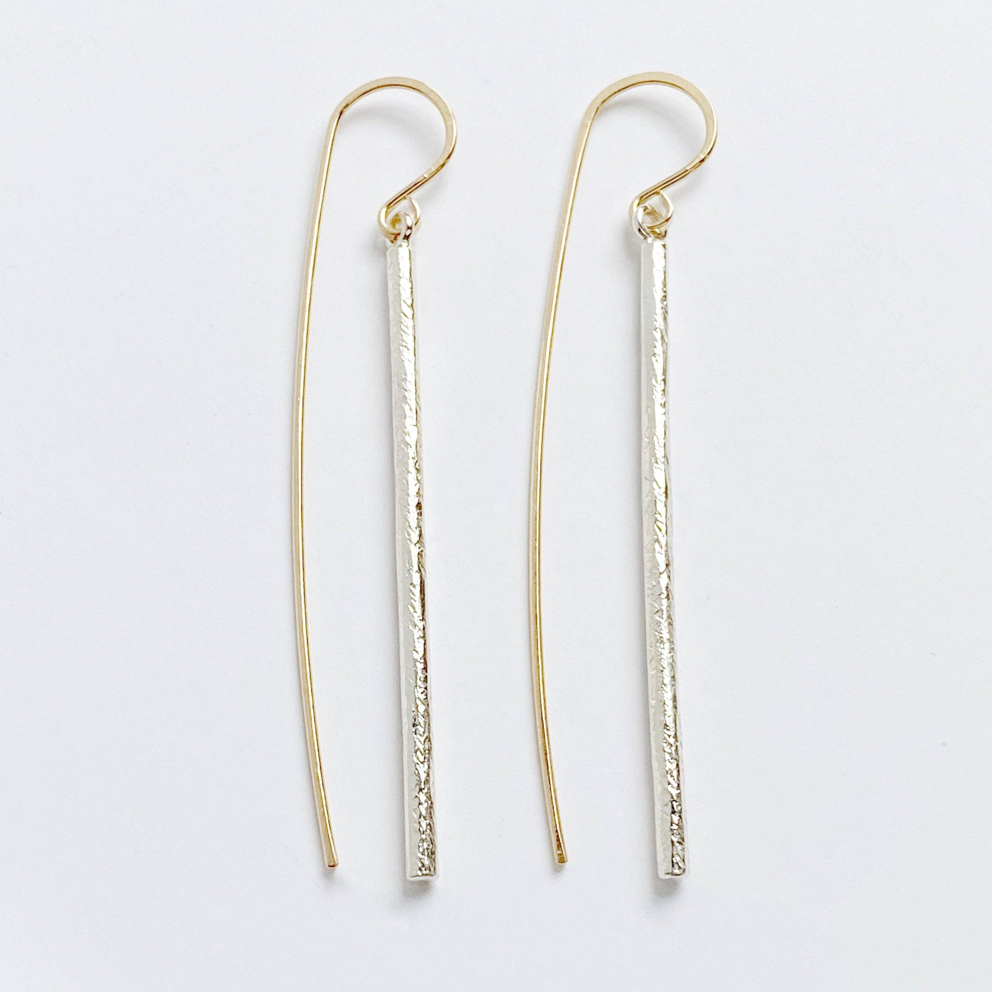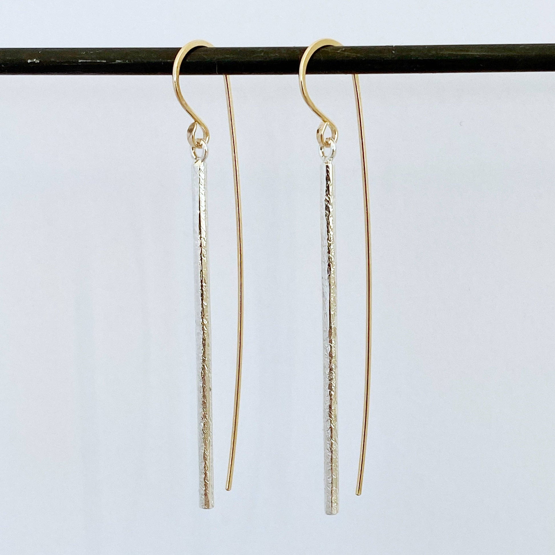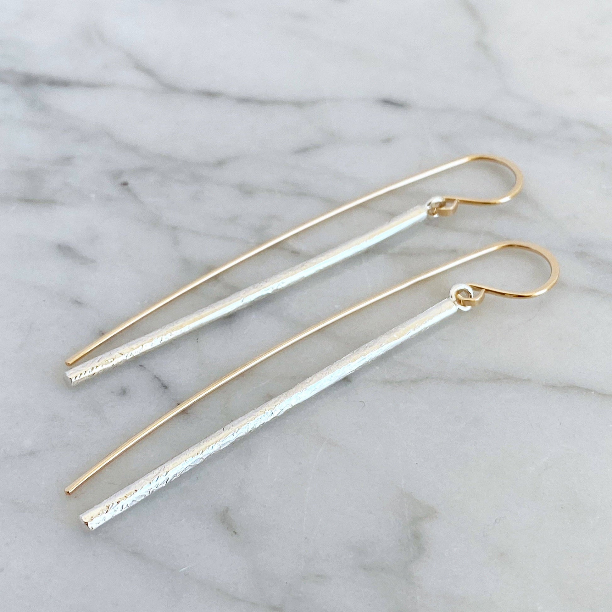 The Linea earring drop- sleek, elegant and a little sculptural. These earrings are a mix of contrast with a clean, straight drop and an organically hammered texture. The elongated 14k yellow goldfill earwire plays a big part in the overall design of the Linea earring- it makes a nice counterbalance to the drop. There's a subtle movement with these earrings- subtle but sassy.
