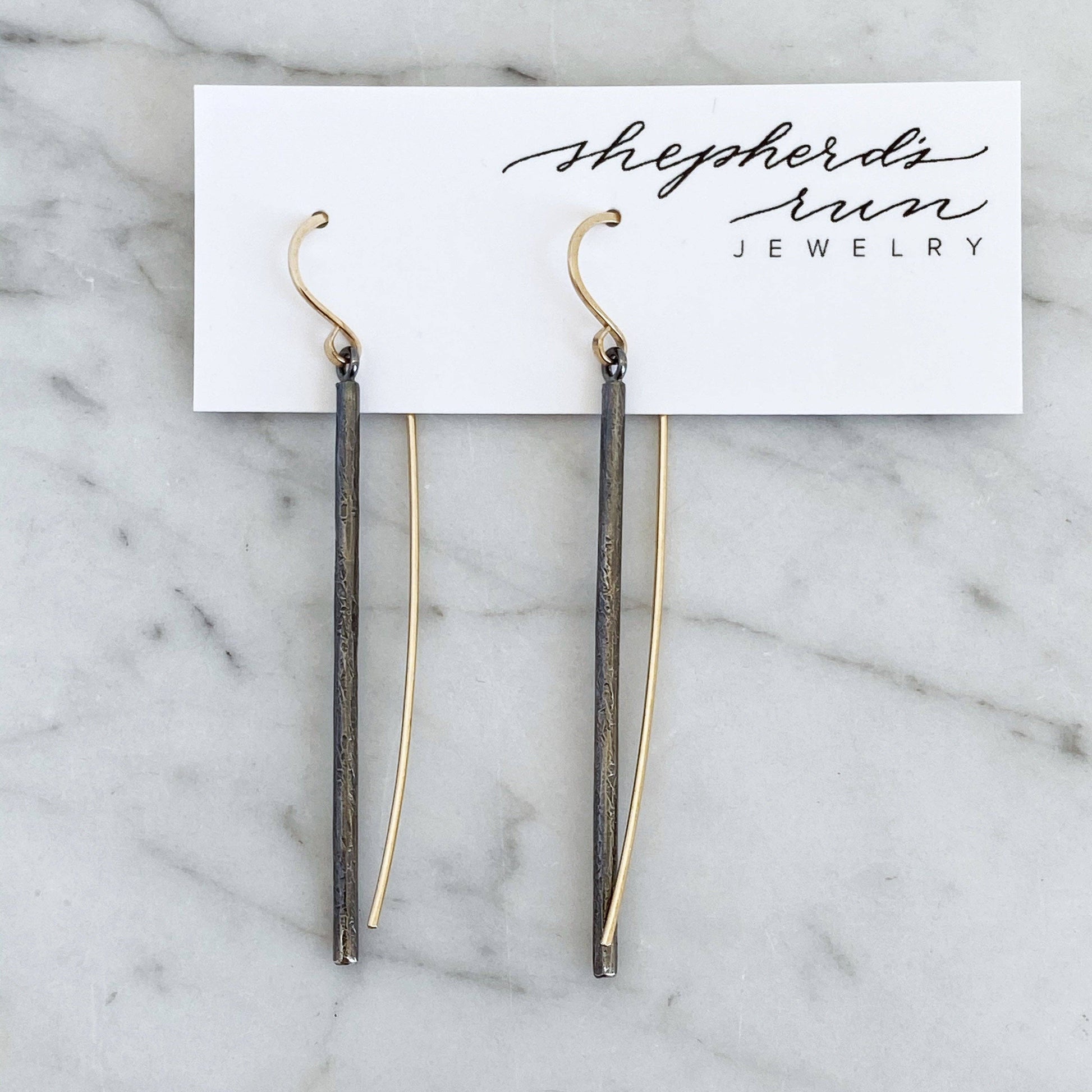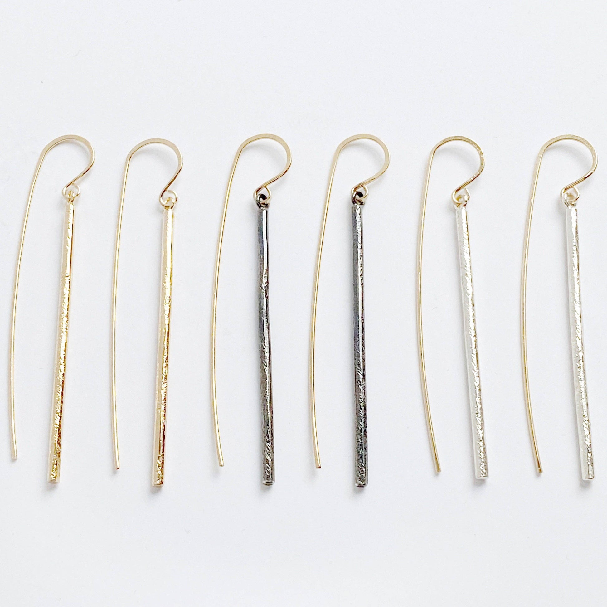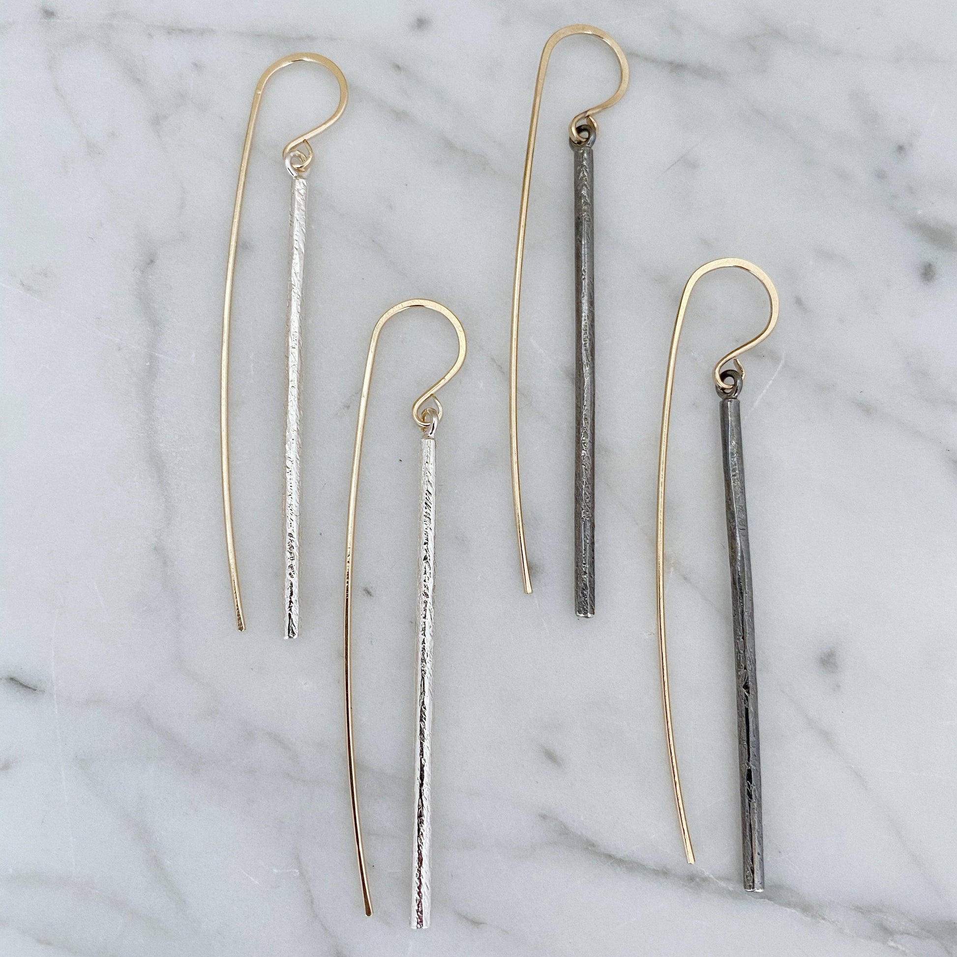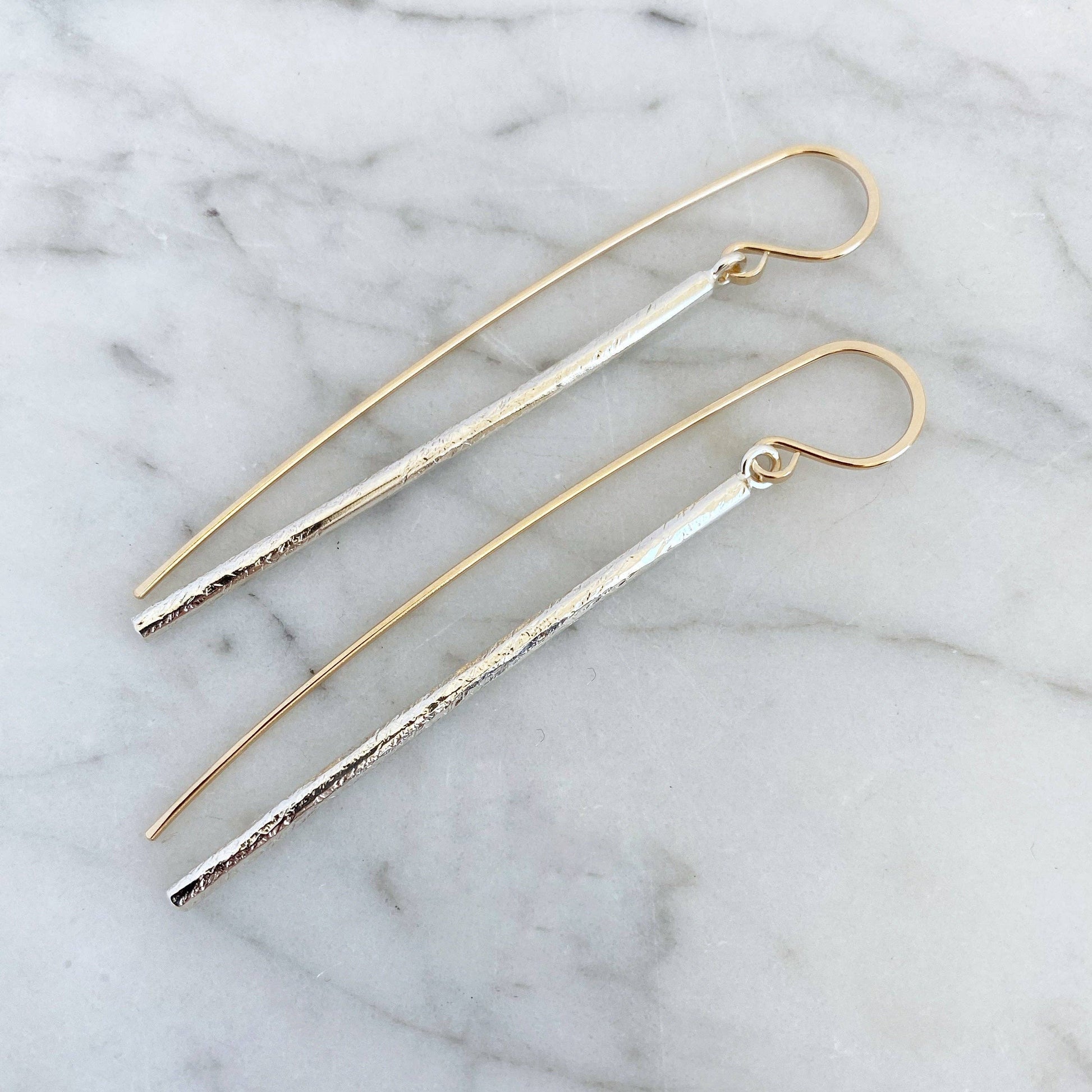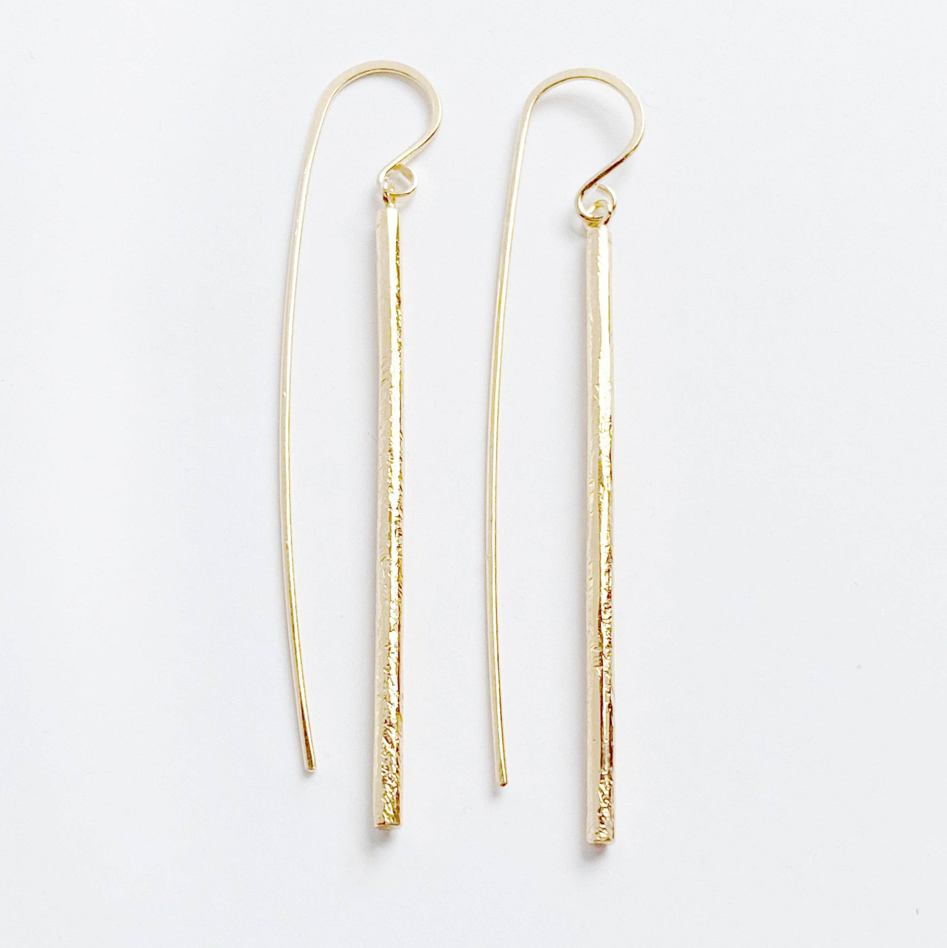 The Linea earring drop- sleek, elegant and a little sculptural. These earrings are a mix of contrast with a clean, straight drop and an organically hammered texture. The elongated 14k yellow goldfill earwire plays a big part in the overall design of the Linea earring- it makes a nice counterbalance to the drop. There's a subtle movement with these earrings- subtle but sassy.