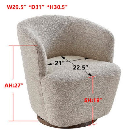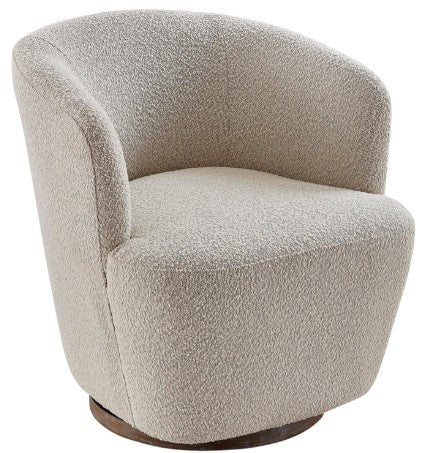 The Monty faux shearling swivel chair has sophisticated soft lines and textured off-white upholstery. The barrel back, track arms, and generous seat offer a clean look. Perched on a slim wooden base finished in rich brown, the swivel chair provides flexibility and a sweeping view with its 360-degree rotation. Perfect for adding texture and a playful touch to any space.