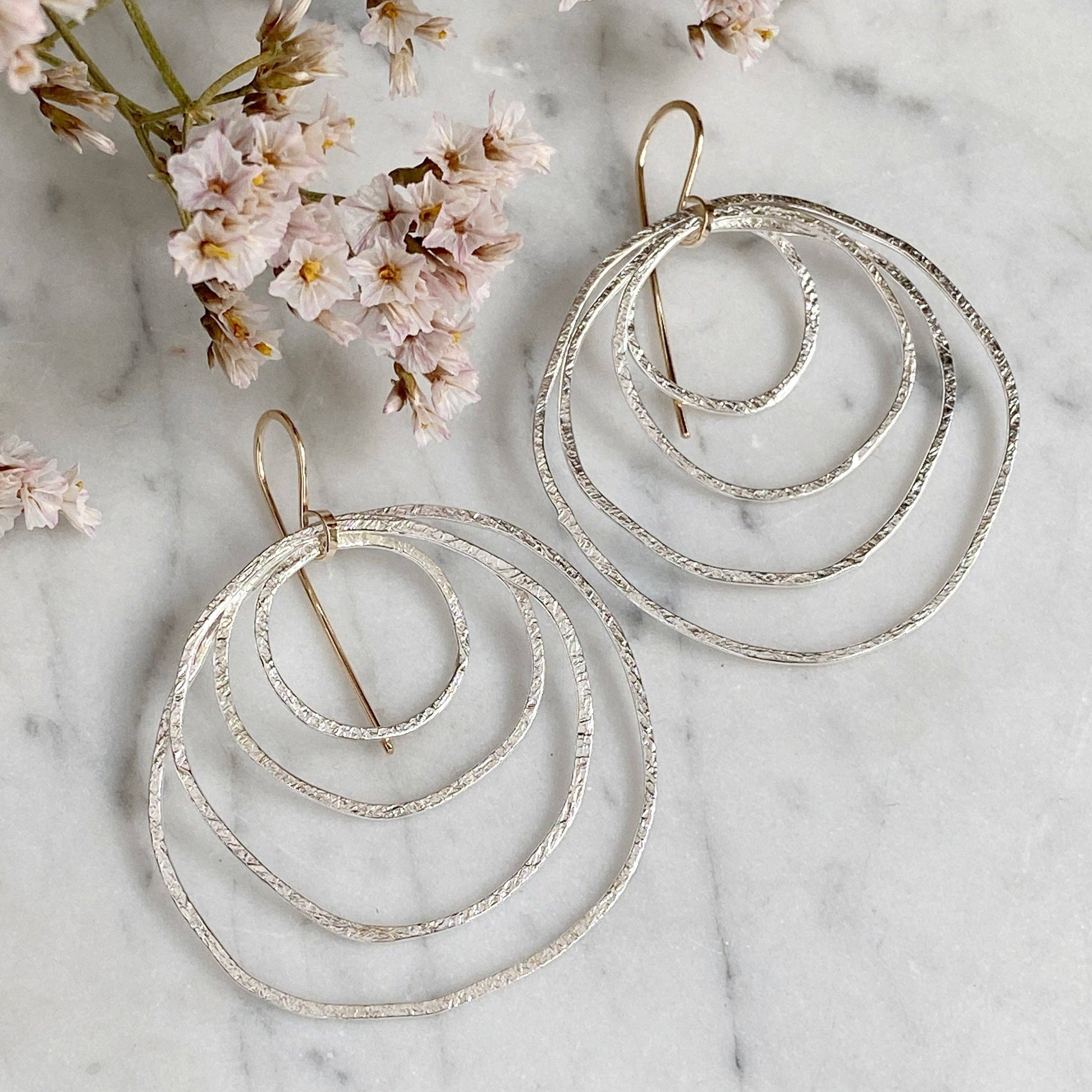 Ripple earrings- a fun, sassy, lightweight attention-getter, these have been a new favorite the last few months. Running about 2 1/4” high and about 1 5/8” wide, including earwire, these textured, layered hoops have movement and personality aplenty. Each eccentric, hand formed and hammered loop has it’s own eccentric character which give these earrings lots of visual interest.