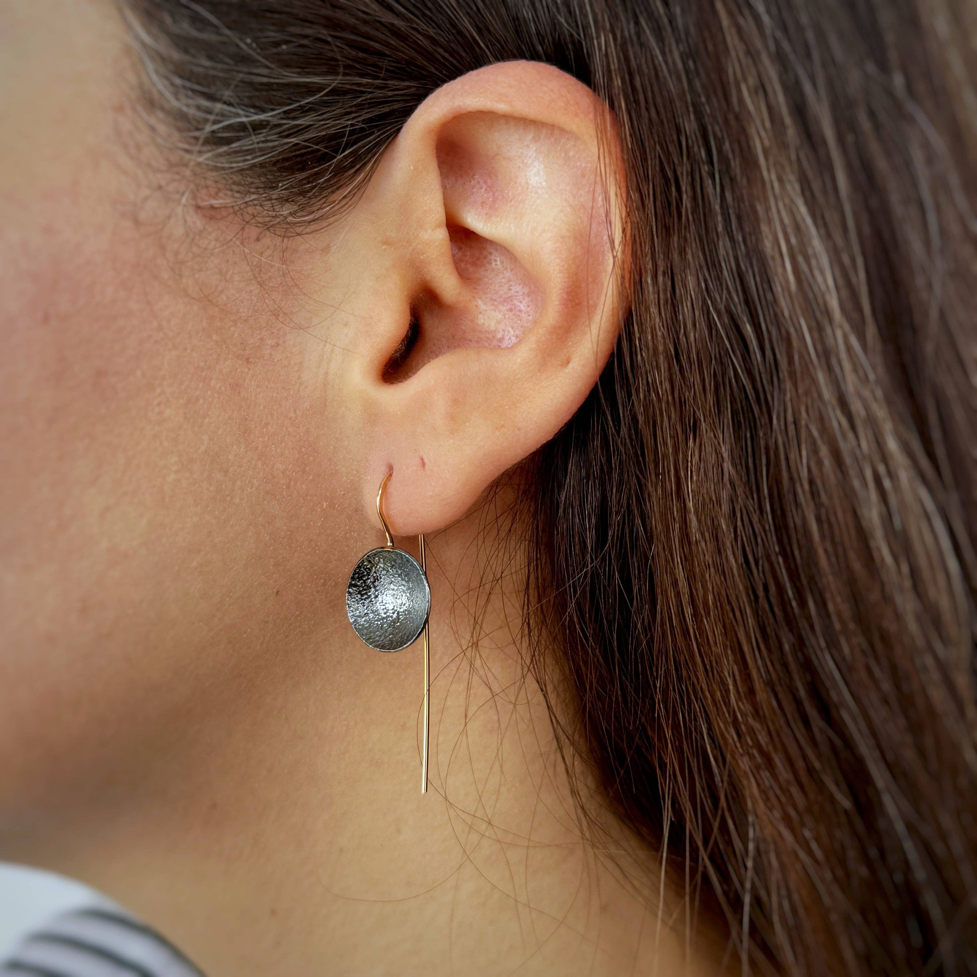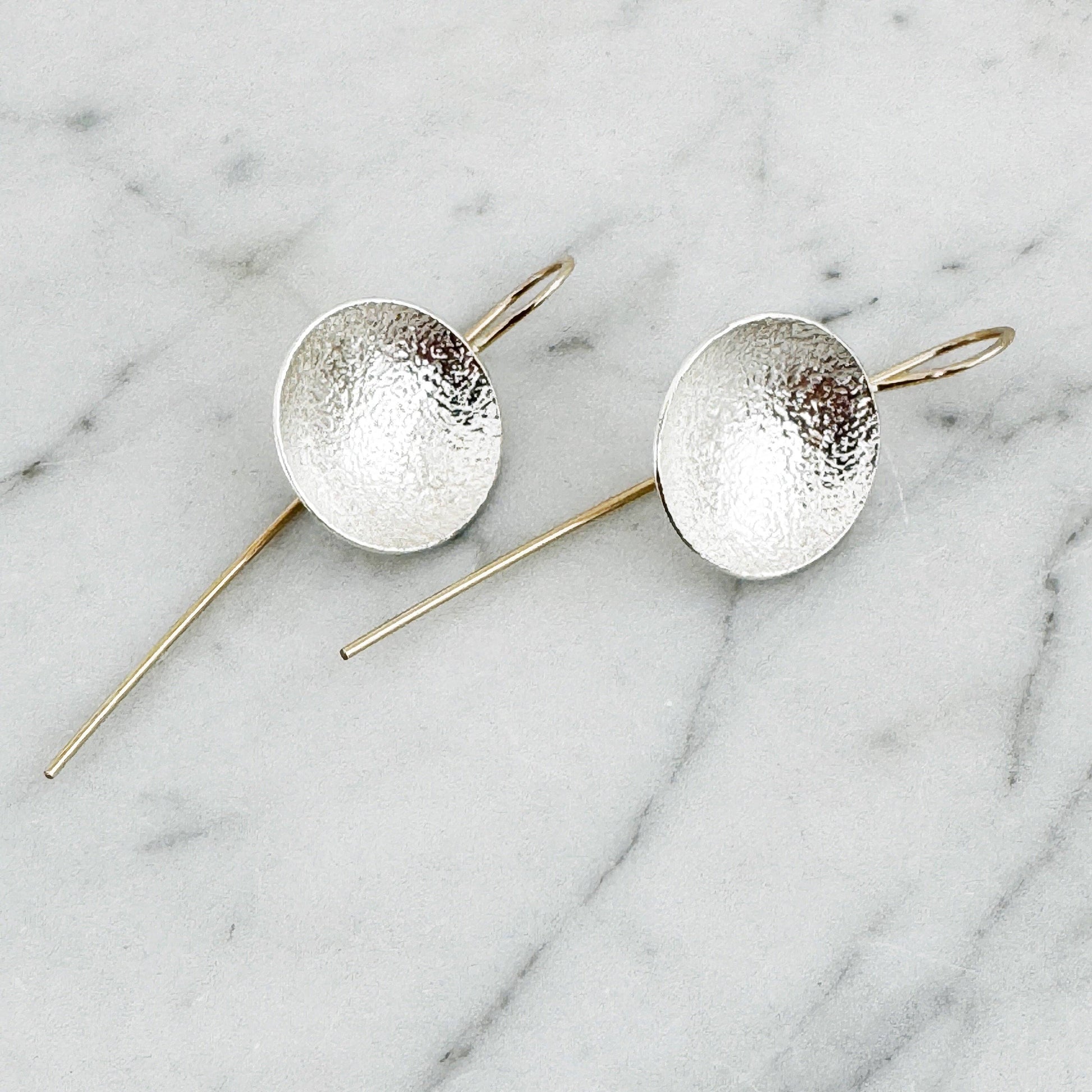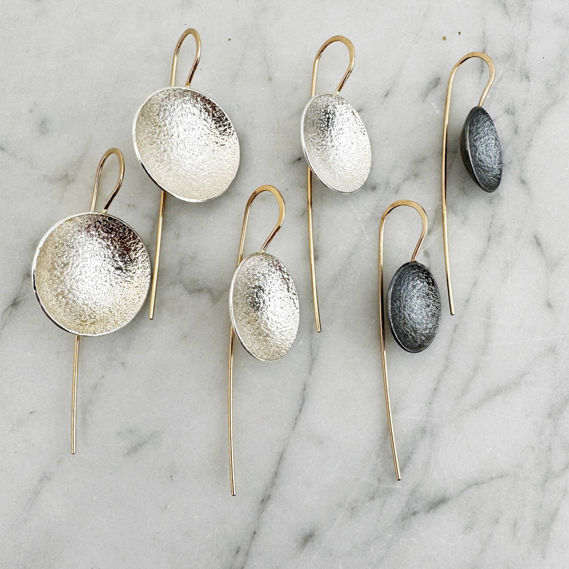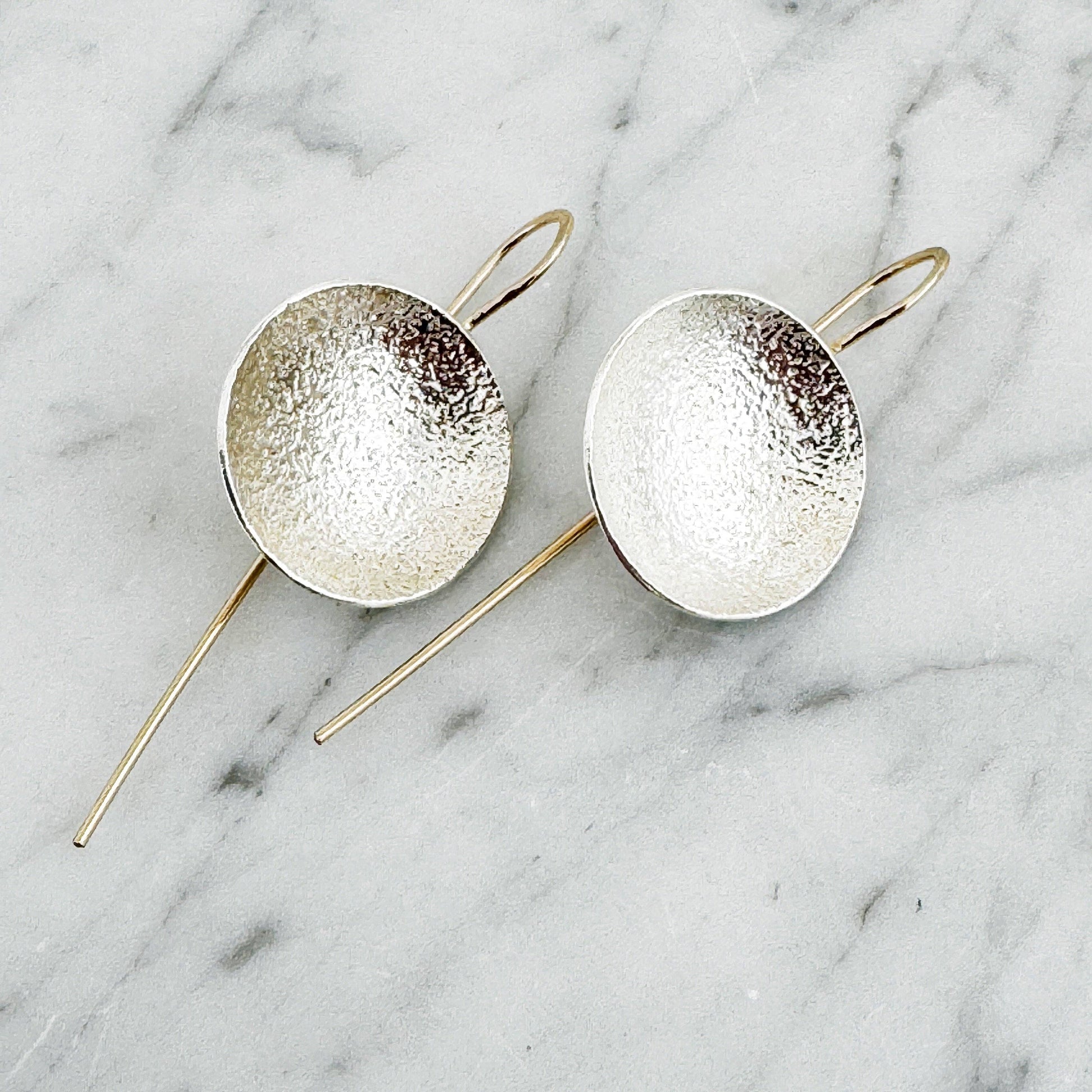 What's the Scoop? These Drop earrings- that's what! These densely textured shallow Argentium silver bowls are suspended from elegant elongated 14k yellow Gold Fill ear wires to give a well balanced and deliciously wearable design.