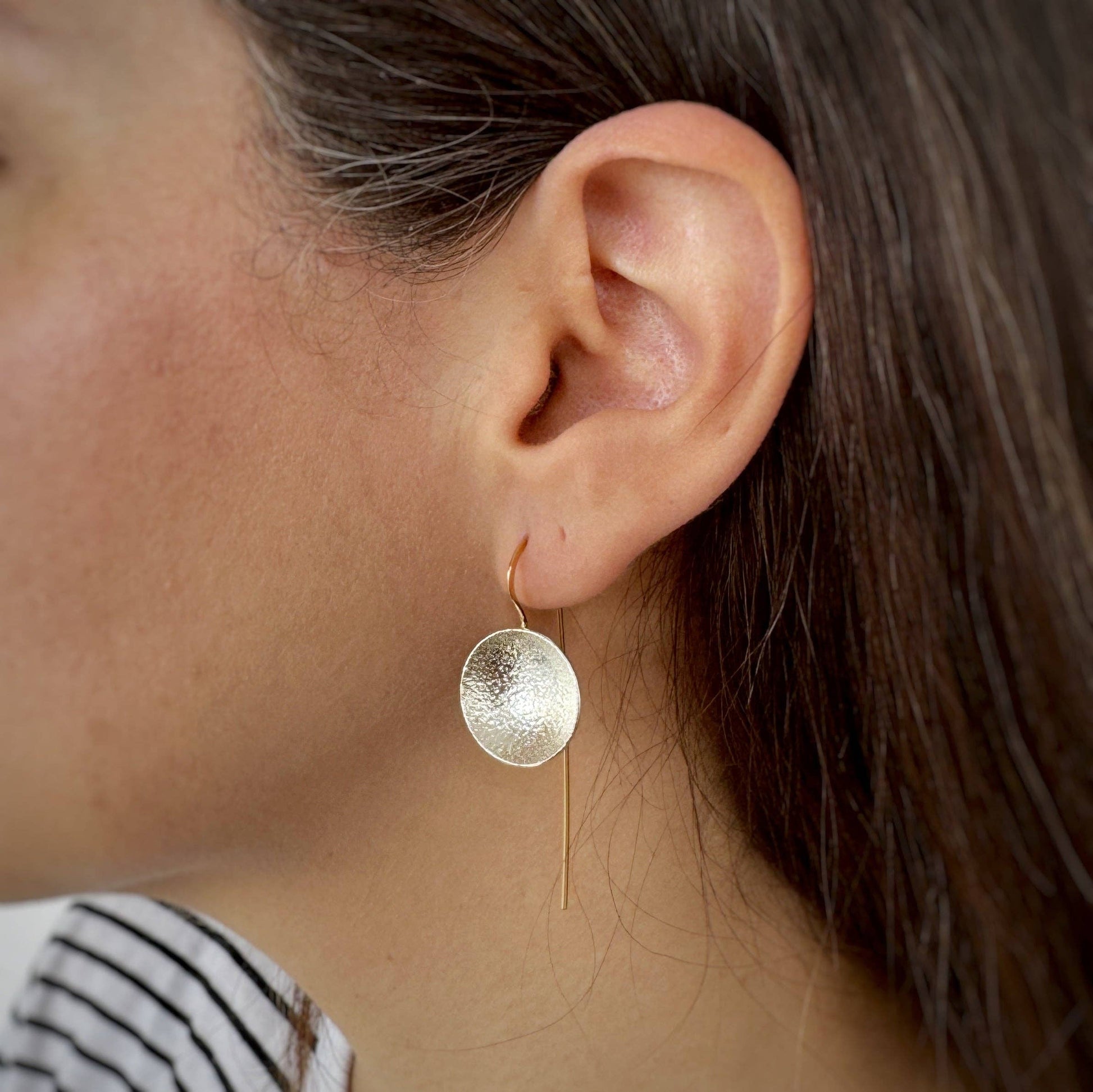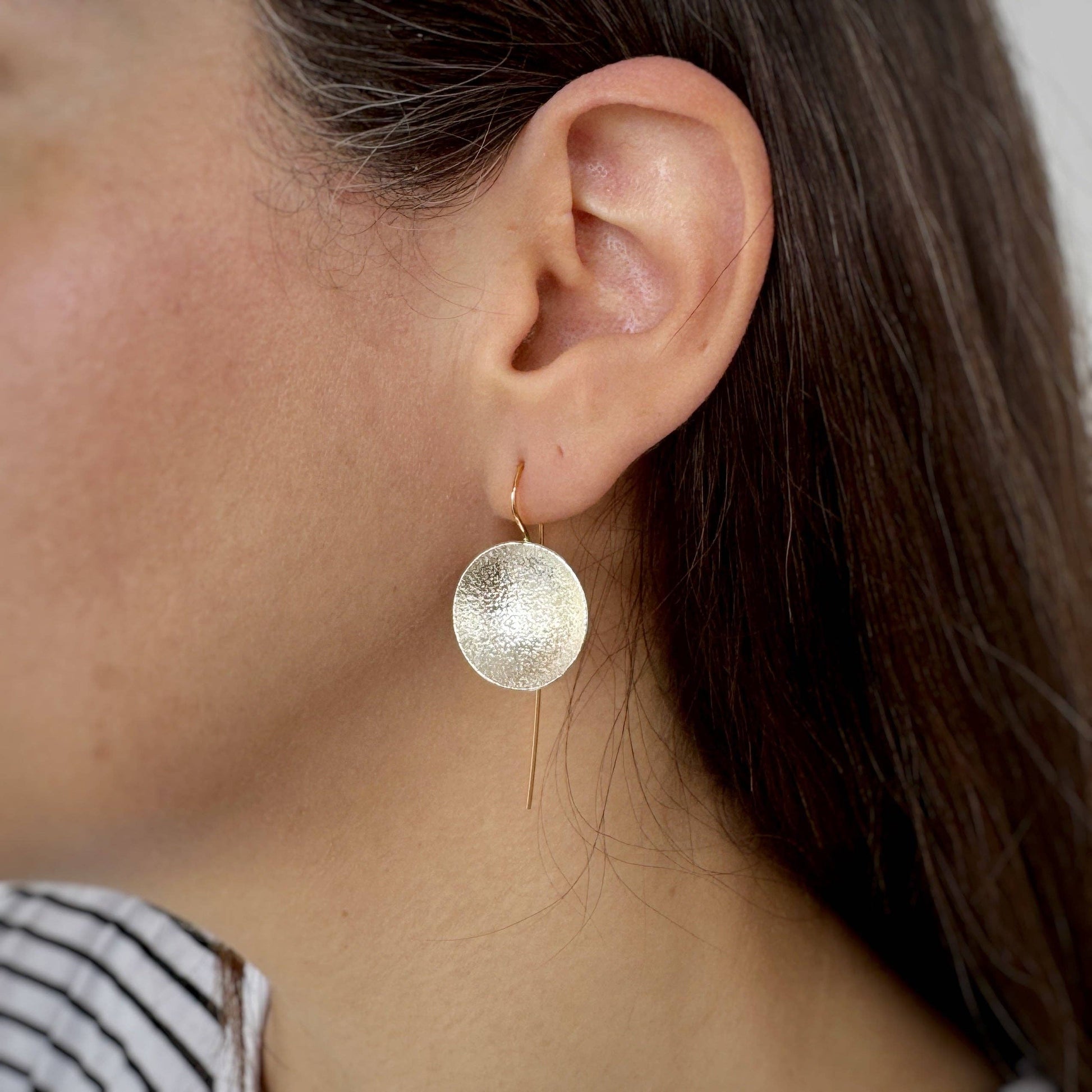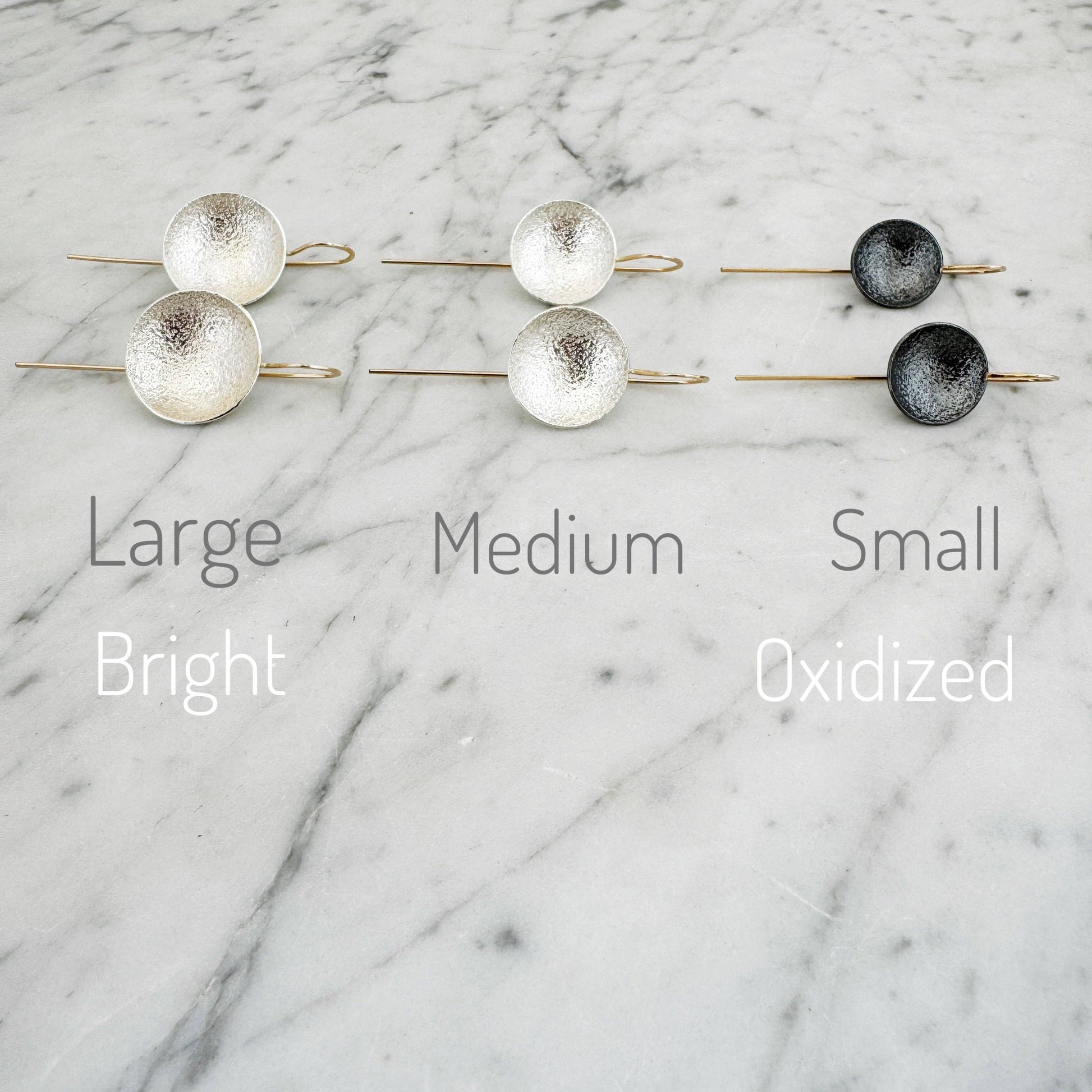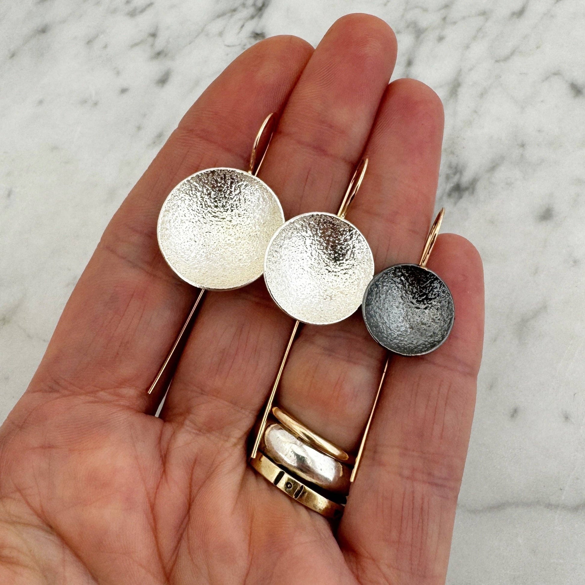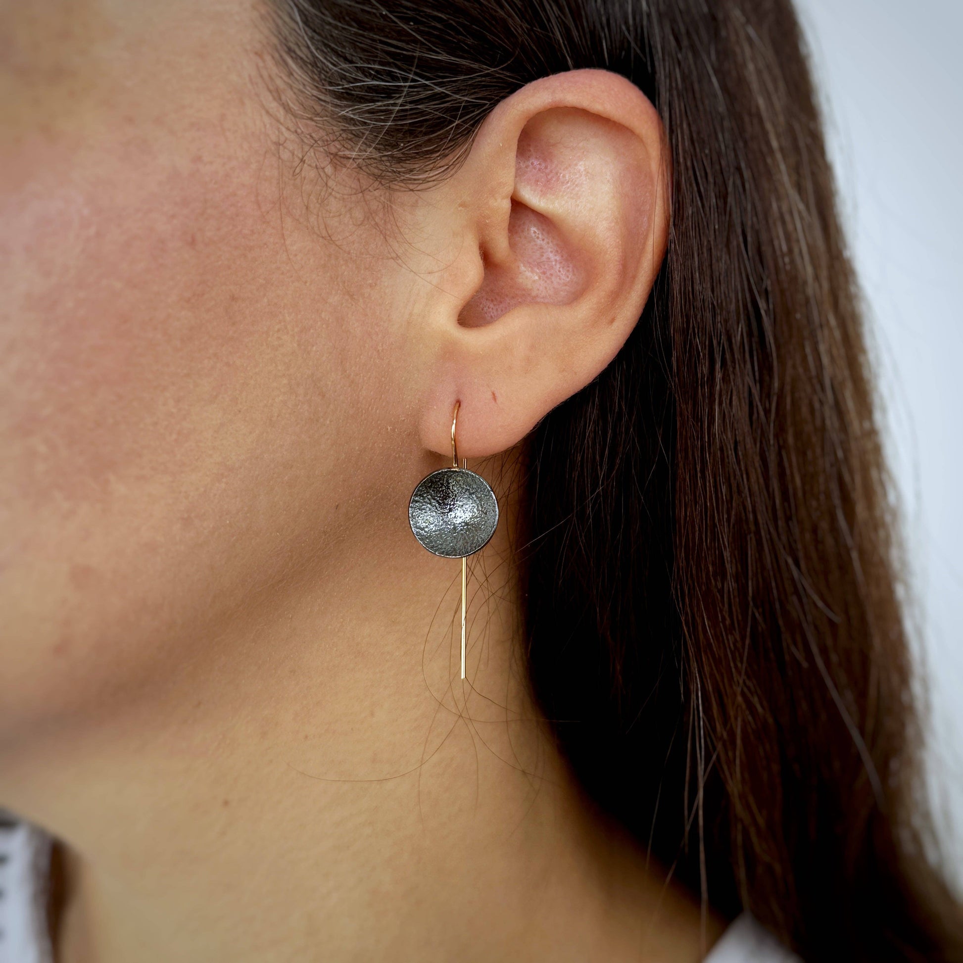 What's the Scoop? These Drop earrings- that's what! These densely textured shallow Argentium silver bowls are suspended from elegant elongated 14k yellow Gold Fill ear wires to give a well balanced and deliciously wearable design.