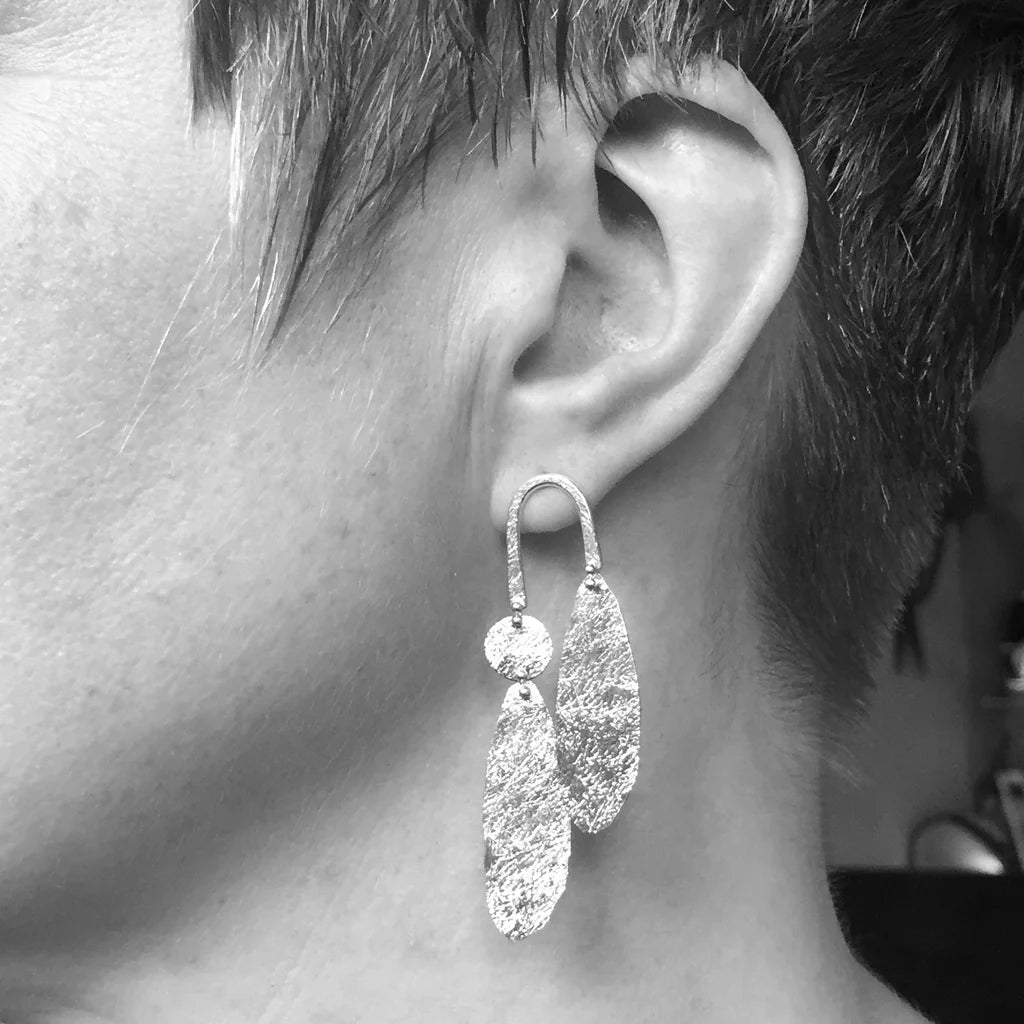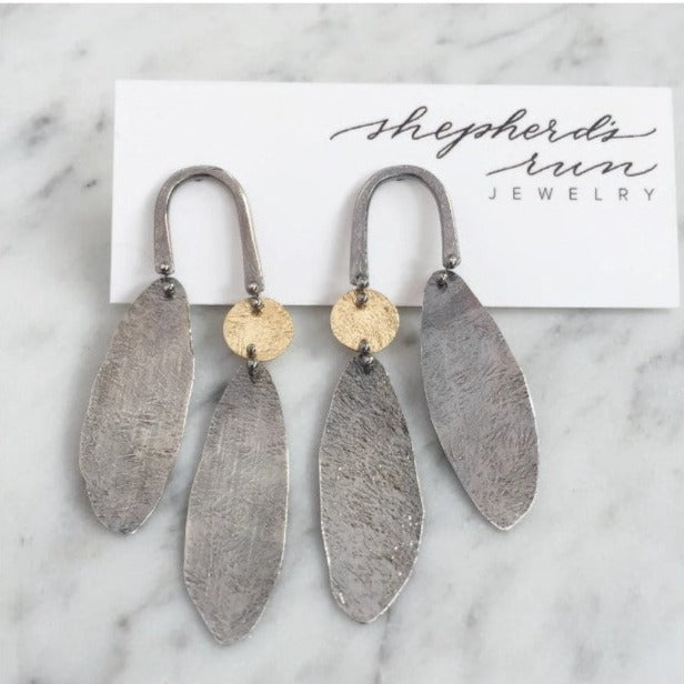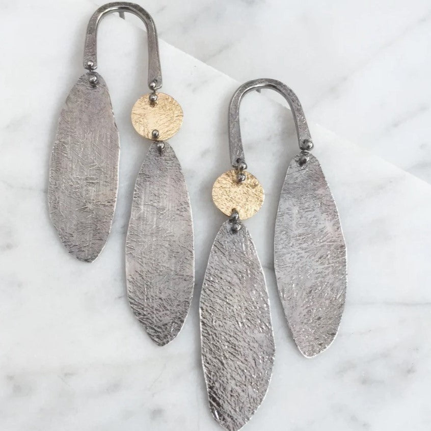These Sycamore Drops- a loose interpretation of whirly-twirly tree bits. A little whimsy and asymmetry with mixed metals. These fun studs are hand sawn, textured and formed out of argentium silver with 14k yellow gold fill accent dots.