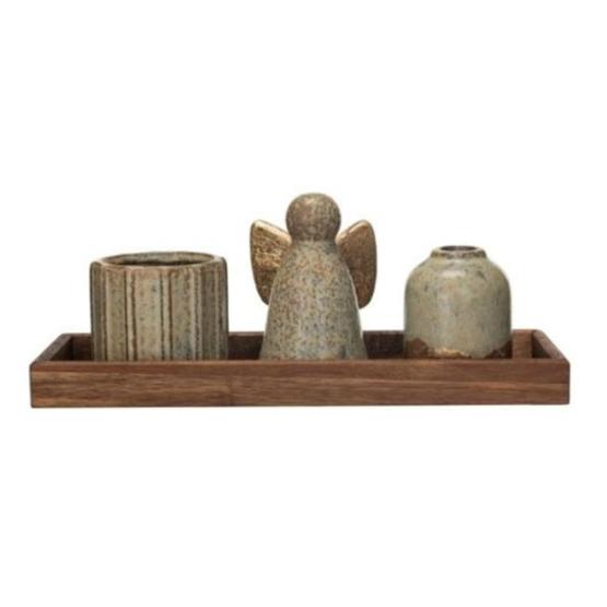 Get a tray that comes with a stoneware planter, taper holder, and an angel accented with gold foil and featuring a stained finish and reactive glaze in a charming beige color.