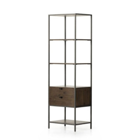 Inspired by clean mid-century design, greyish auburn poplar and raw iron fuse for plenty of storage space by way of open shelving and dual drawers. Metal-secured leather pulls add a textural element of surprise. Great alone or doubled and paired with matching media console.