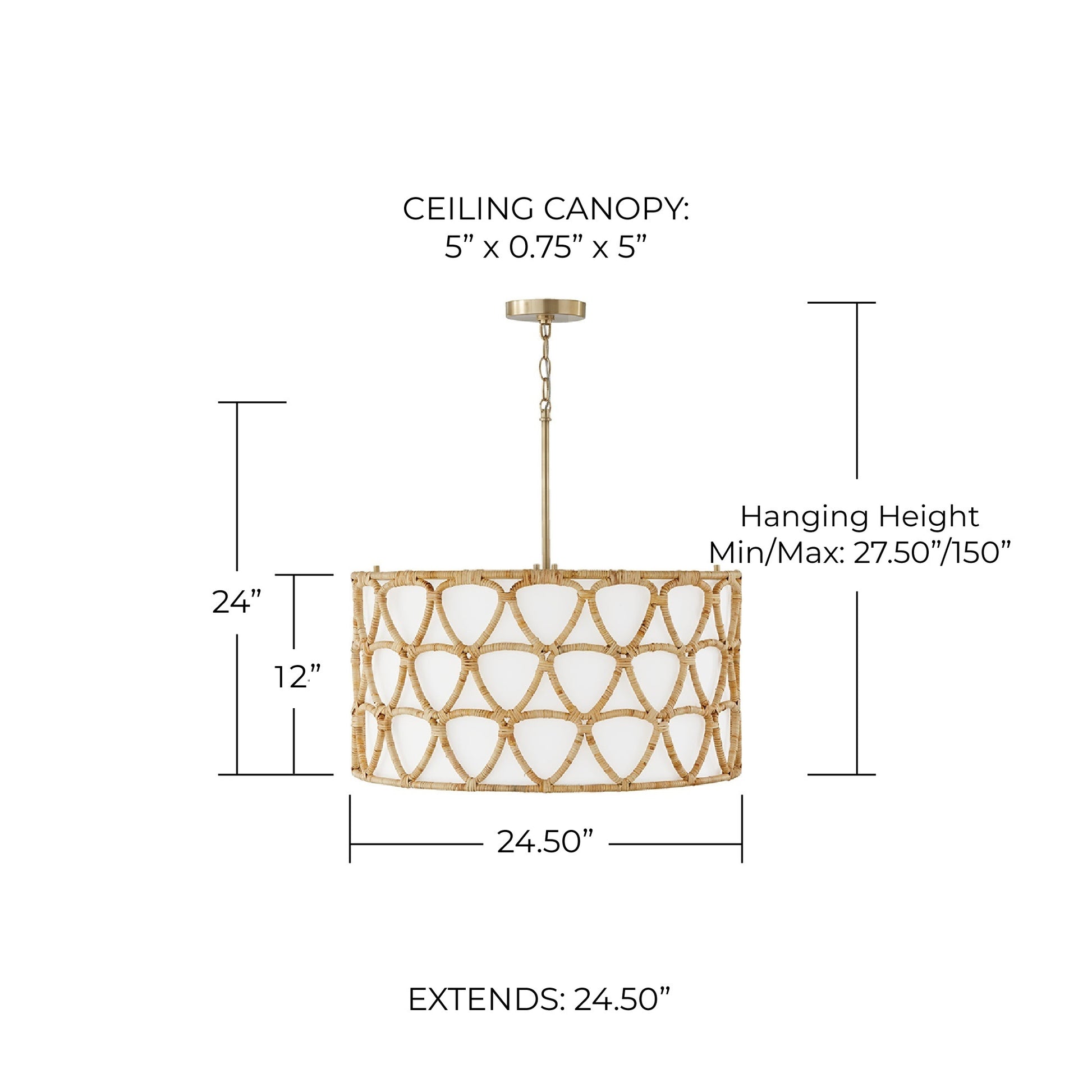 The Tulum Medium Pendant creates a new look on natural style. Hand wrapped rattan highlights the unique pattern which contrasts against the crisp, white fabric drum shade. Modern shapes in natural tones paired with hints of Matte Brass bring bohemian chic to any space.