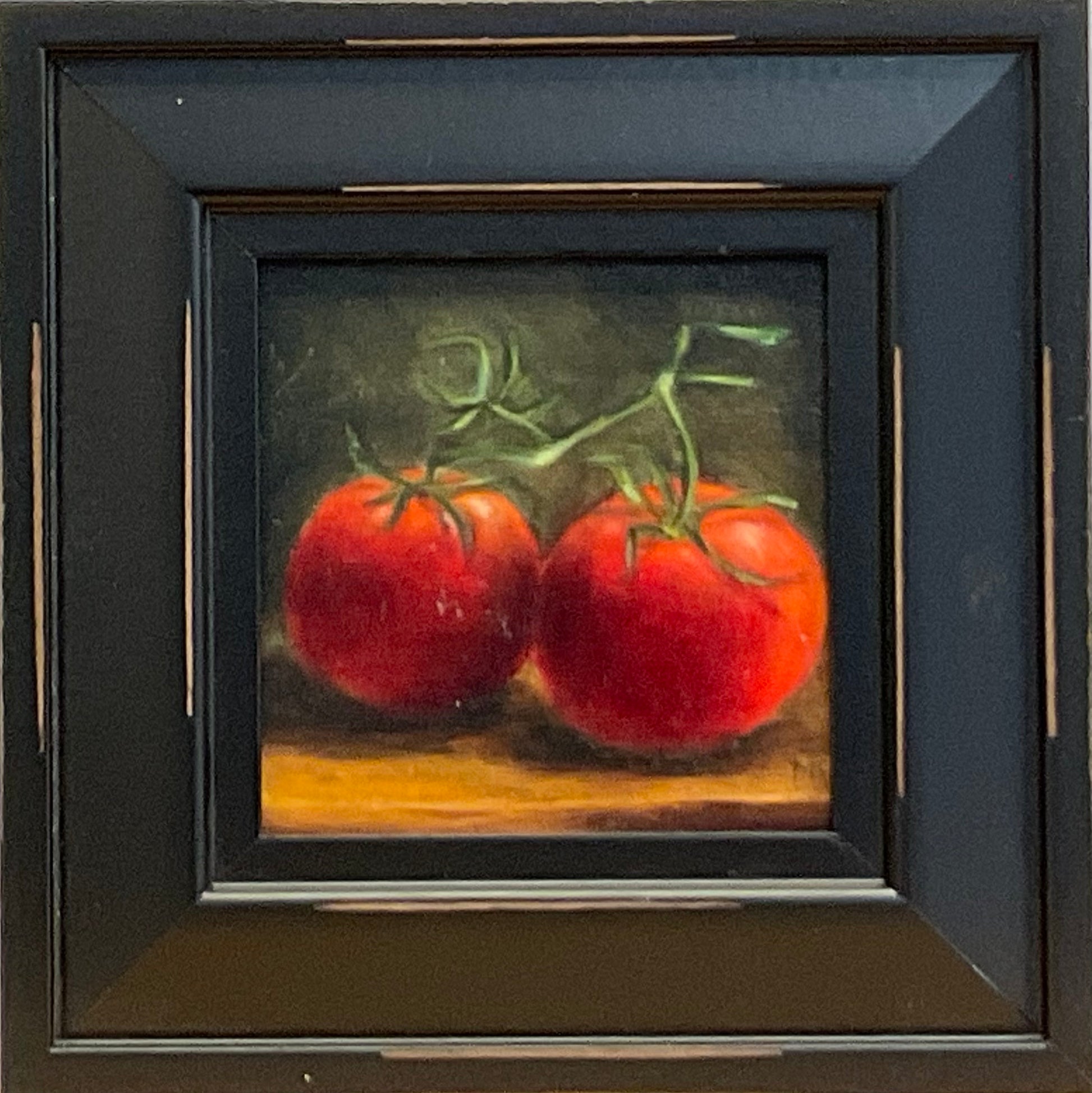 This charming Vine Tomatoes original oil painting, perfectly showcased in a distressed black frame. Measuring 6.75" by 6.75", it adds a delightful touch of local artistry to any space.