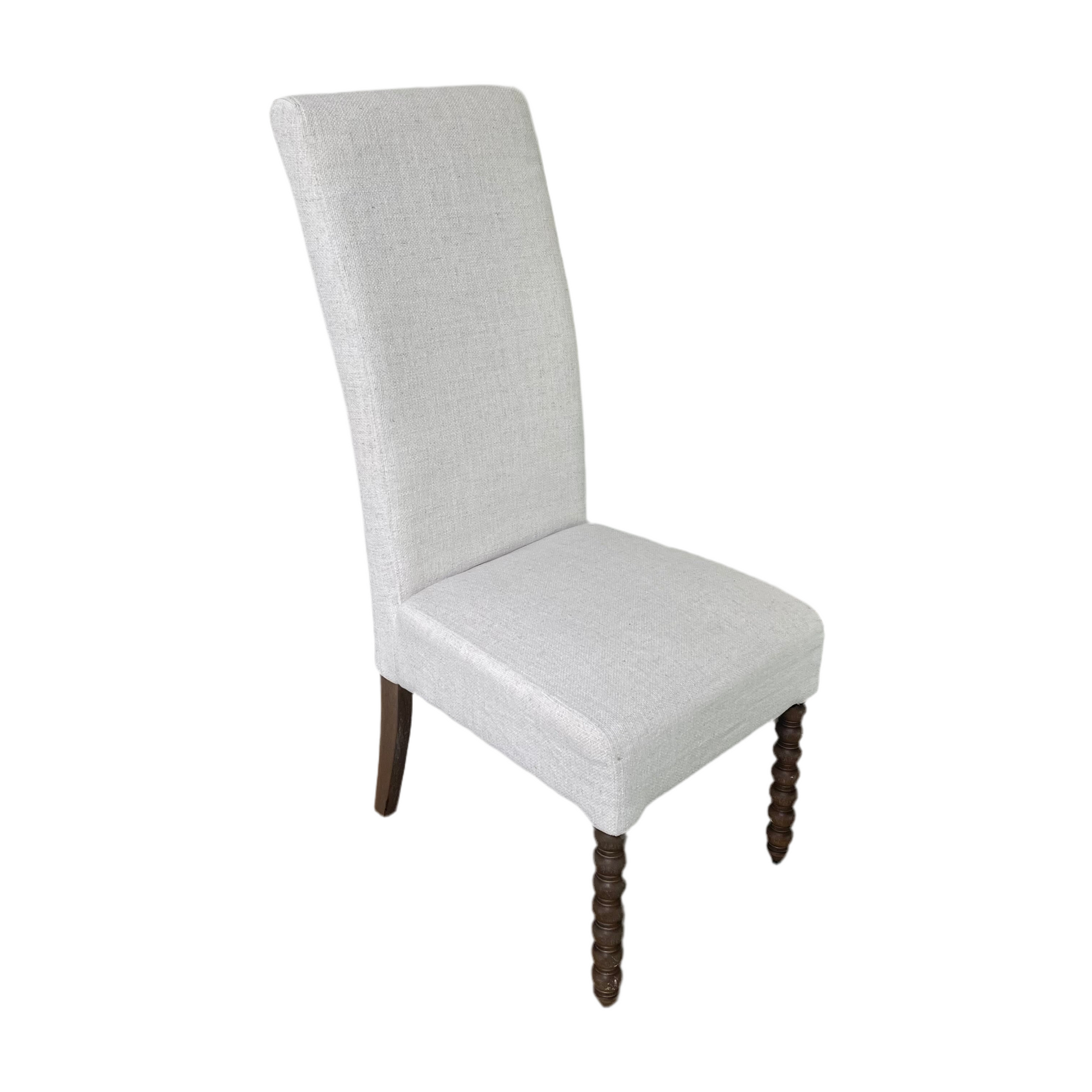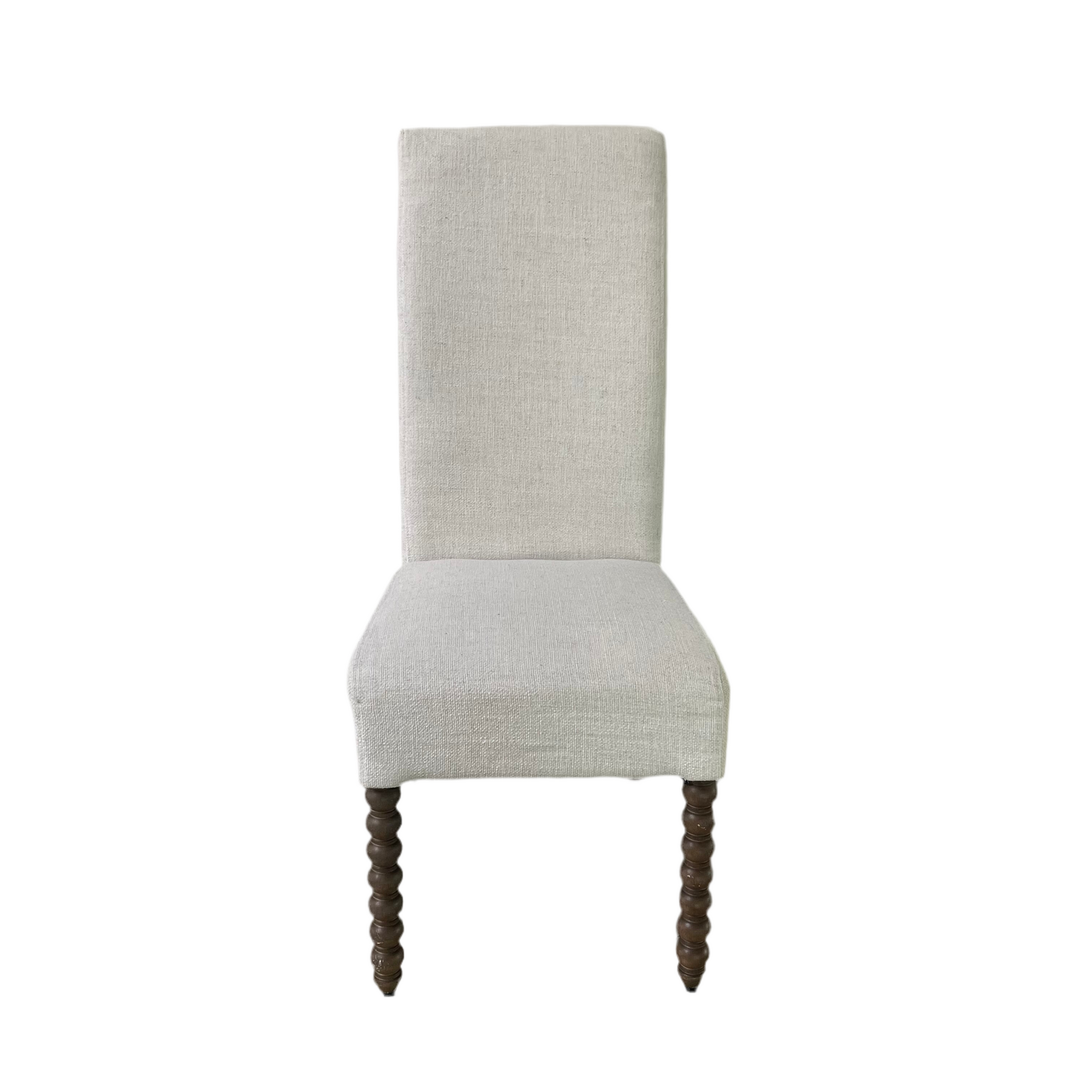 White Upholstered parsons chair with wooden legs. Dimensions: 17”w x 21”d x 44”h